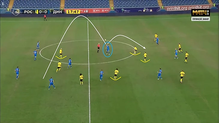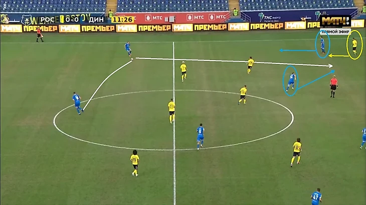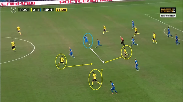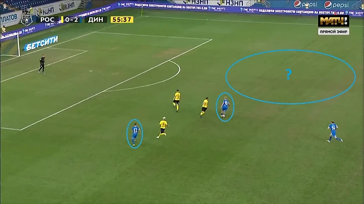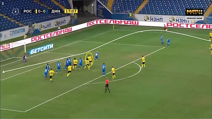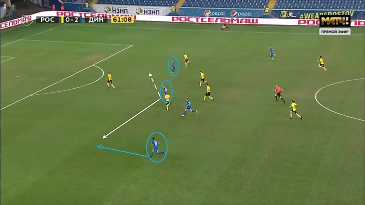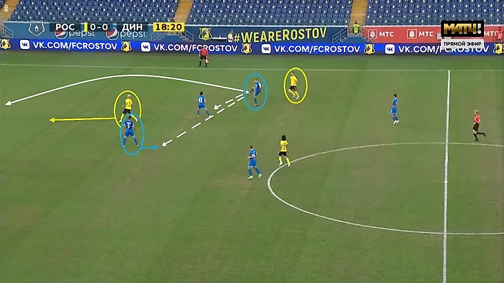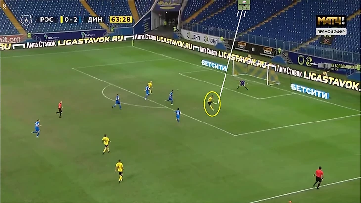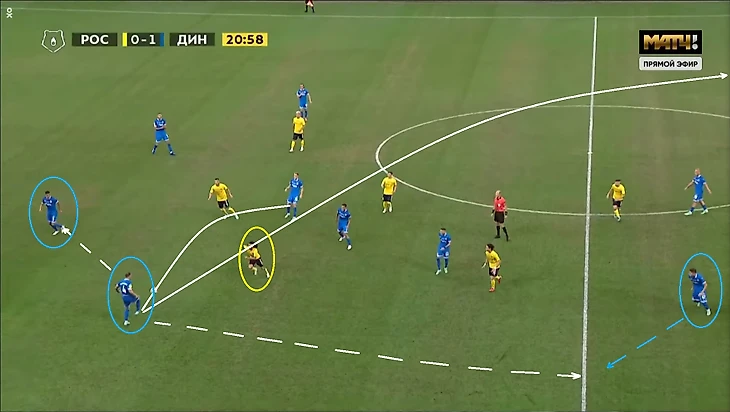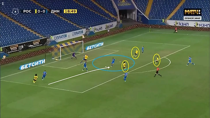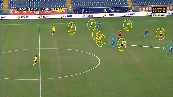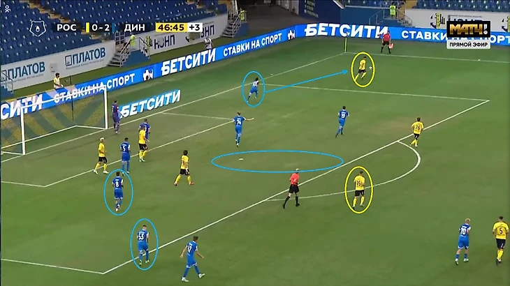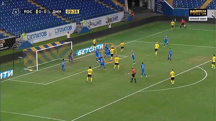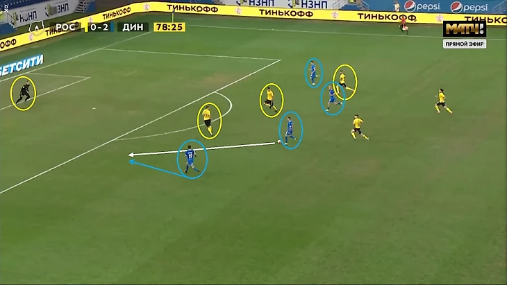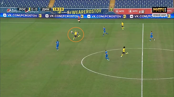 Не воспользовавшись таким подарком Ростов тут же пропускает гол после нашей позиционной атаки. Центр полузащиты хозяев вначале упустил Моро, а затем не уследил за открыванием Шиманьски. Честно скажу, мне подумалось, что Себа упустил момент для удара, но к счастью ему удалось отдать пас на свободно набегающего Захаряна, который и пробил точно в одно касание — 0:1. Хочу обратить ваше внимание на концентрацию ростовских игроков на правом фланге, но дело тут не в их количестве, а их полной пассивности. До матча Шварцом отмечалось, что Ростов играет в такой же манере как и Динамо, и, видимо, делает такие же ошибки как и мы.