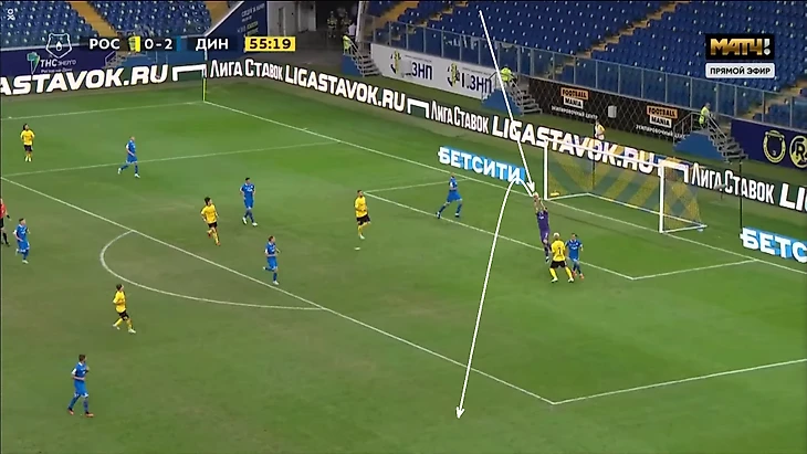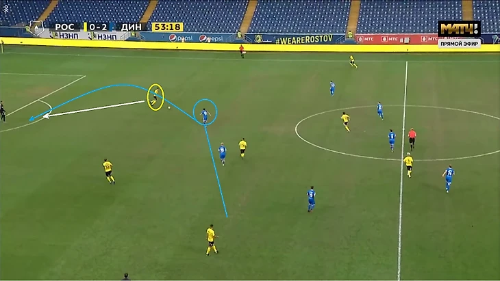 На грубую игру Ростова Динамо ответило голом! Голевой атаке, а точнее угловому, предшествовал перехват Шиманьски в центральном круге, очень важного подбора Фомина и проход Лесового слева. Бальбуэна отлично пробил после подачи, а Тюкавин был первым на добивании после сейва Песьякова — 0:2. К слову сказать, Бальбуэна выиграл дуэль у Калинина. Подбор Фомина: