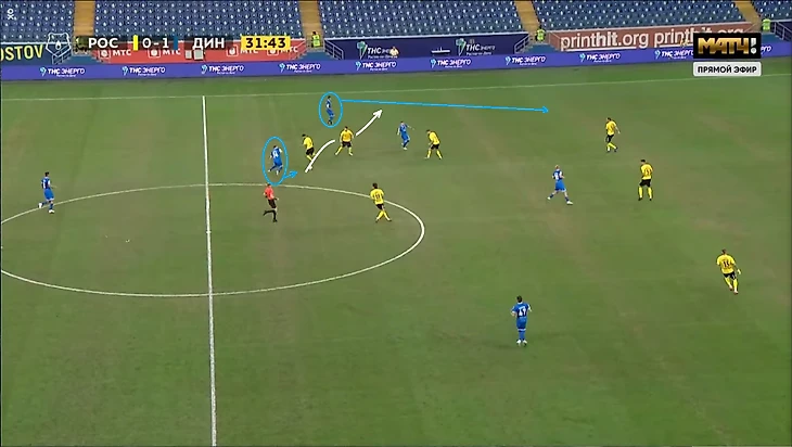 По истечении 15 минут игра выровнялась, мяч стал дольше контролироваться игроками обеих команд. На забросы и диагонали Ростова мы отвечали короткими и средними пасами. За первую треть первого тайма я мог бы выделить Диего Лаксальта за его и хорошую игру в обороне и за попытки разогнать наши атаки слева. На противоположном флаге практически был незаметен Захарян, а до Тюкавина мяч просто не доходил. Не смотря на то, что Динамо выровняло игру, ещё один опасный момент случился у наших ворот: по непонятной причине наша защита оставила одного Комличенко и тому не хватило точности, чтобы пробить в створ ворот. А ведь именно в таких моментах мы частенько пропускали голы…