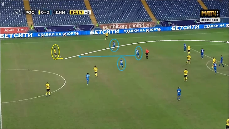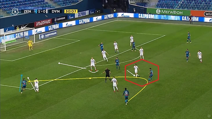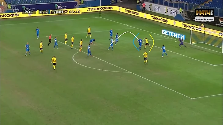 Увы, про «хорошее применение» Игбуна я не могу сказать. Да, Слай очень старается, но Динамо просто не его команда. Но может работая со Шварцем и он сможет стать лучше. Вот например, дебютировавший Кутицкий вовремя резко выдвигается на соперника, лишая того времени на подготовку точной передачи — удар от ворот.
