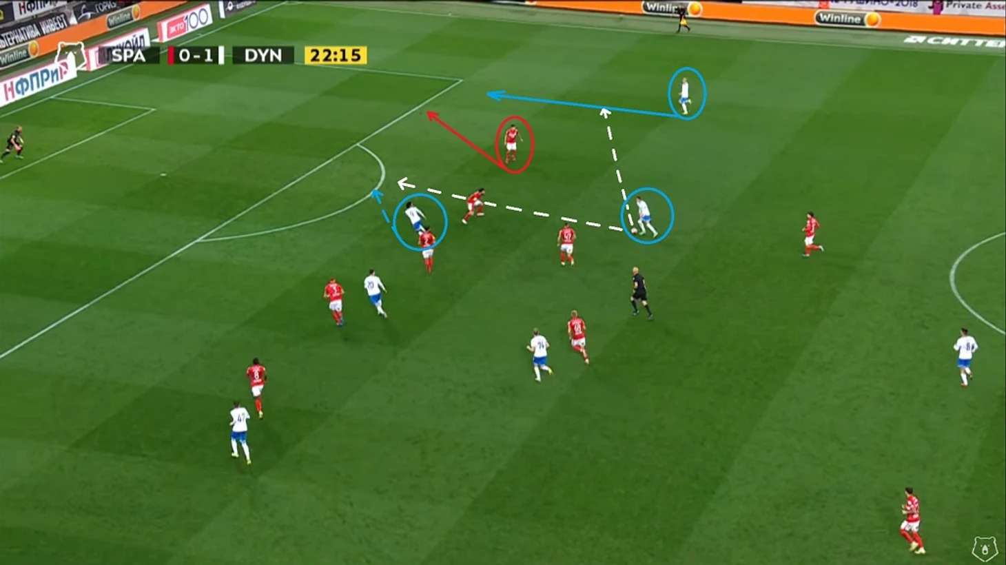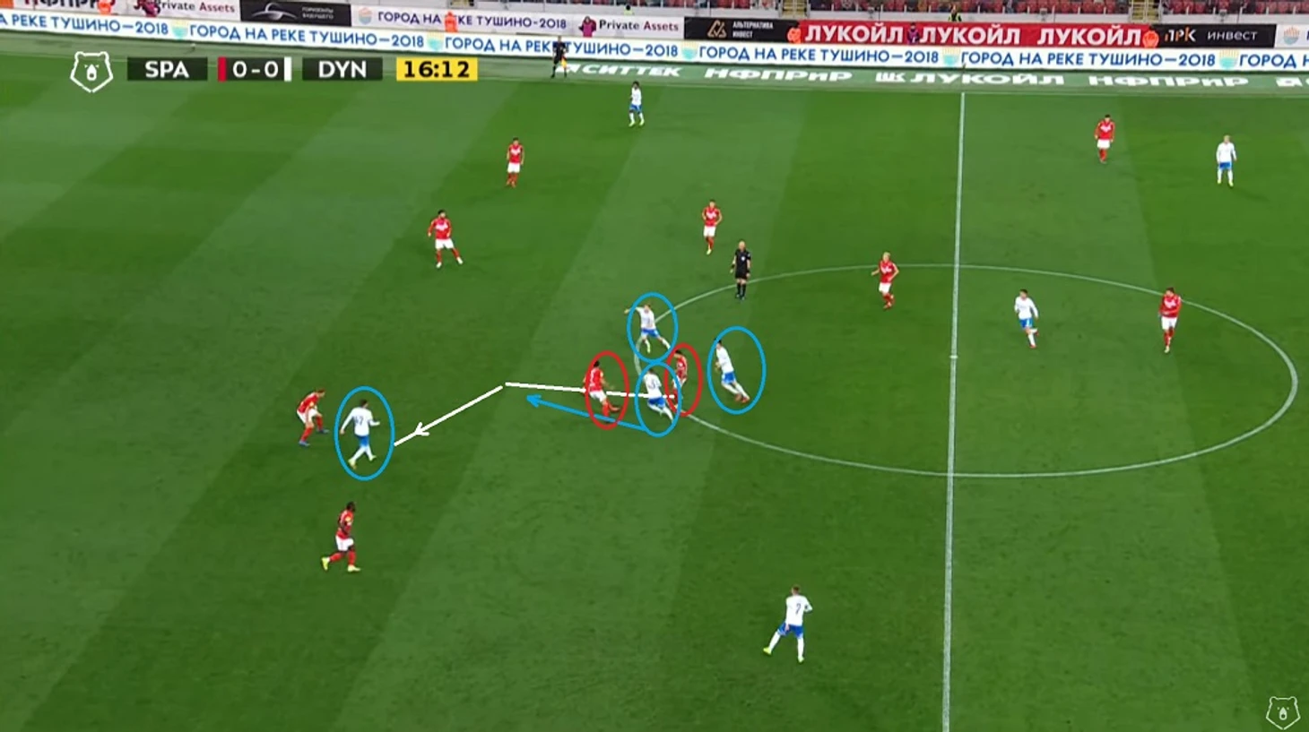 Прошло 15 минут. Скорости немного утихли, мячом больше владеют хозяева, а Динамо не показывает ничего из того, что умеет. Первый настоящий момент у гостей возник не в результате осмысленной атаки, а в следствии неточной передачи из-за, наконец-то, хорошего прессинга Динамо в центре поля. Вот этот момент. Причём обратите внимание, что ниже всех среди выделенных игроков оказался Грулёв, хотя по идеи он должен быть выше всех.