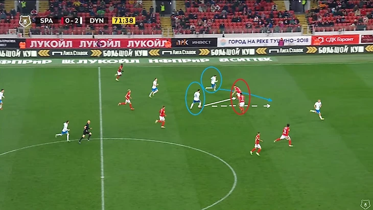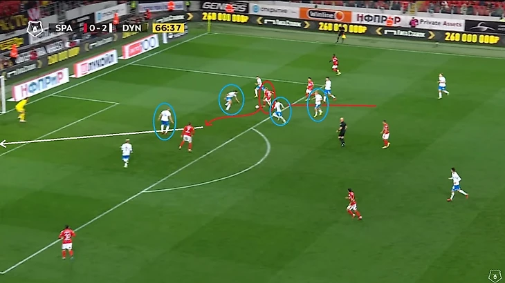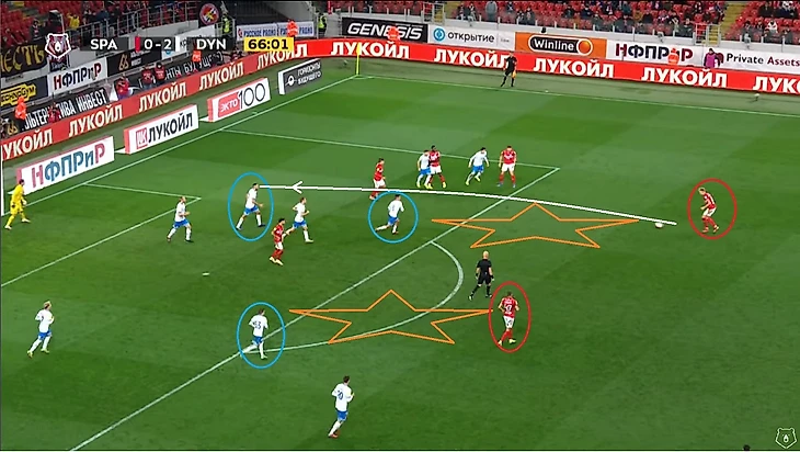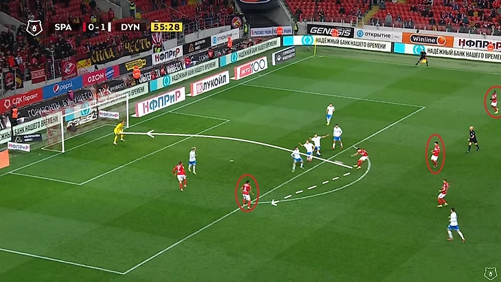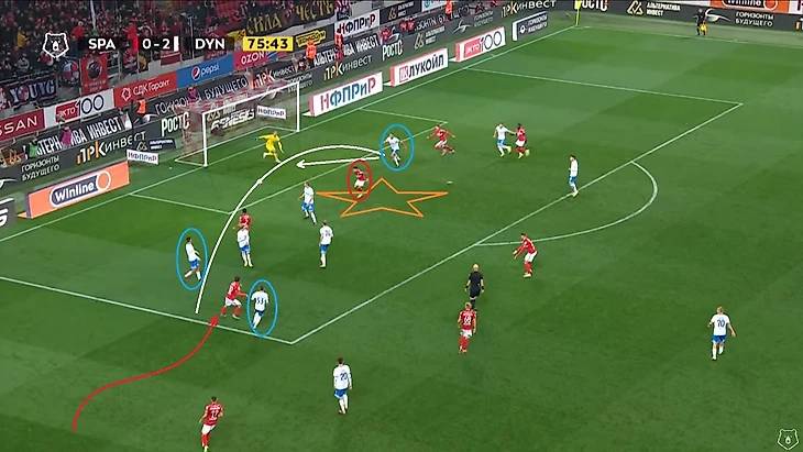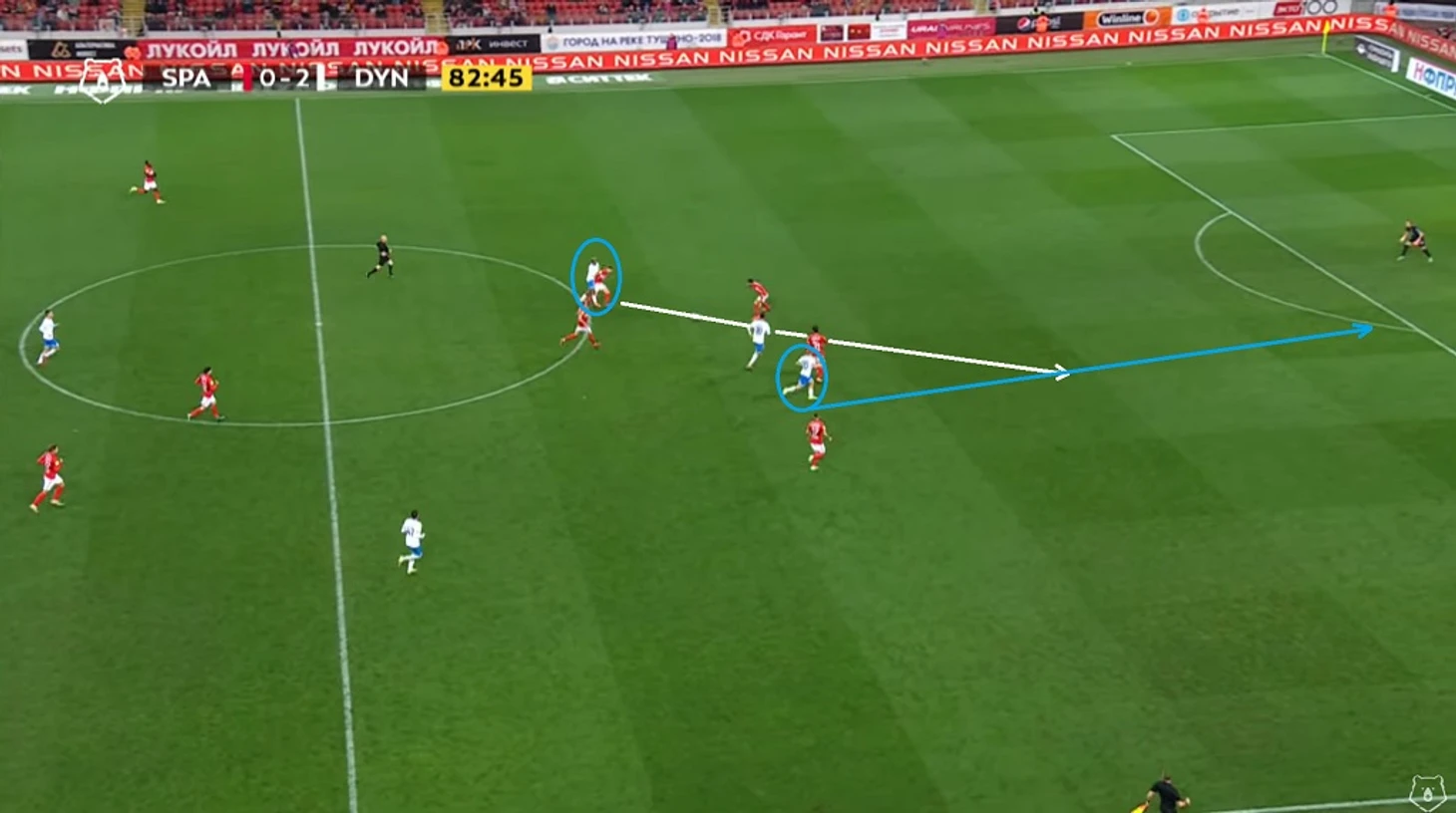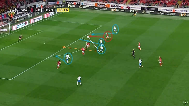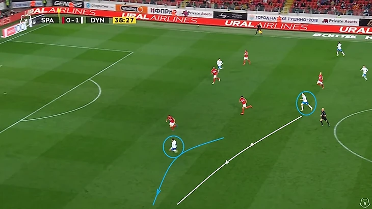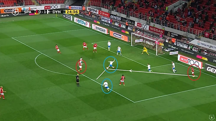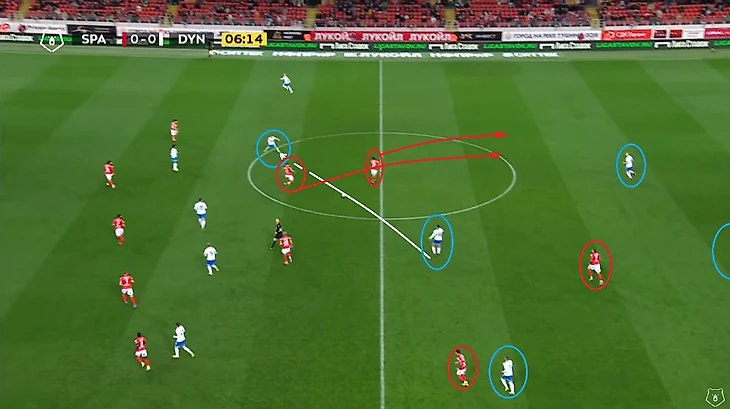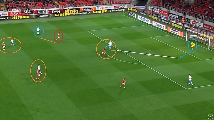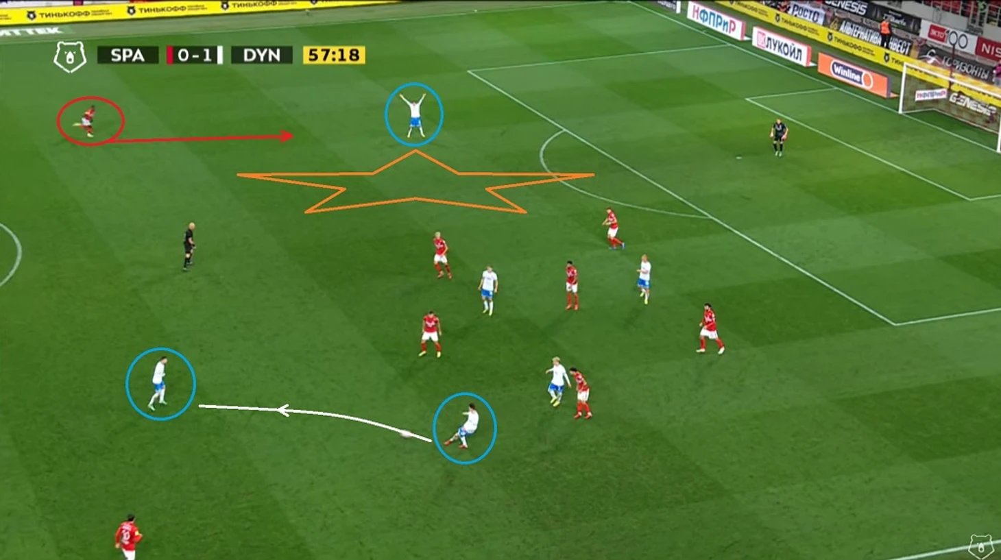 Минутой позже тот же Моро дважды оказывается первым на подборе мяча, но у Динамо не получается развить позиционную атаку. В свою очередь Спартак завёл свою позиционную атаку в нашу штрафную, но в этот раз мяч даже не дошёл до Шунина (вспоминаем гол Смолова через частокол ног наших защитников).