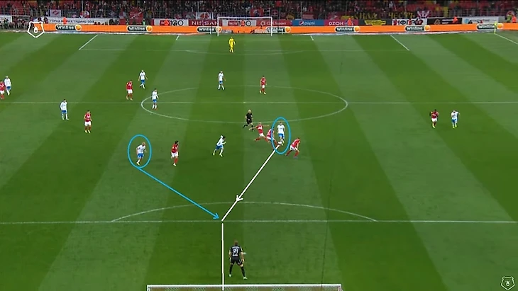 Сама атака закончилась опасным ударом в сторону ворот. Я же хочу отметить, что мы в снова не смогли грамотно распорядиться мячом, и вместо острой передачи на Нжи у Шиманьски получился пас на защитника. Если бы с мячом в центре оказался бы Захарян, то возможно он сыграл бы хитрее, несильно отпасовав между центральными защитниками, чтобы или левый нападающий, или Фомин смогли успеть к мячу и расстрелять ворота Максименко. Мы знаем, Арсен иногда делает такие тонкие передачи в штрафную, но со своего левого фланга.