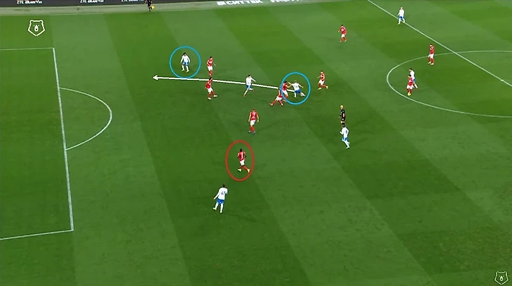 После забитого гола скорости снова возросли и уже за счёт игры нашей команды, при этом нам есть ещё где прибавлять. Например, в скорости работы с мячом. В следующем моменте Шиманьски делает несколько лишних касаний, тем самым немного сбивая темп, а ведь у него было сразу несколько вариантов продолжения быстрой атаки: или сразу на Варелу или на Нжи. Пауза Себы заставила притормозить обоих его партнёров.