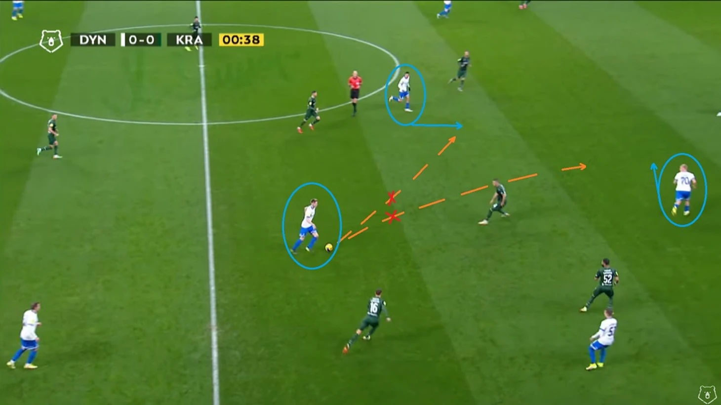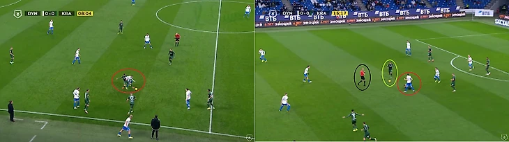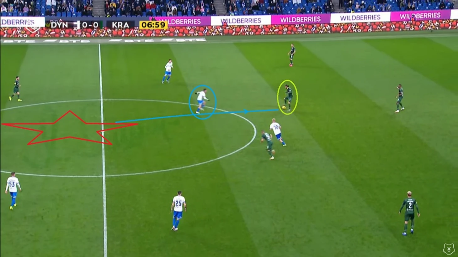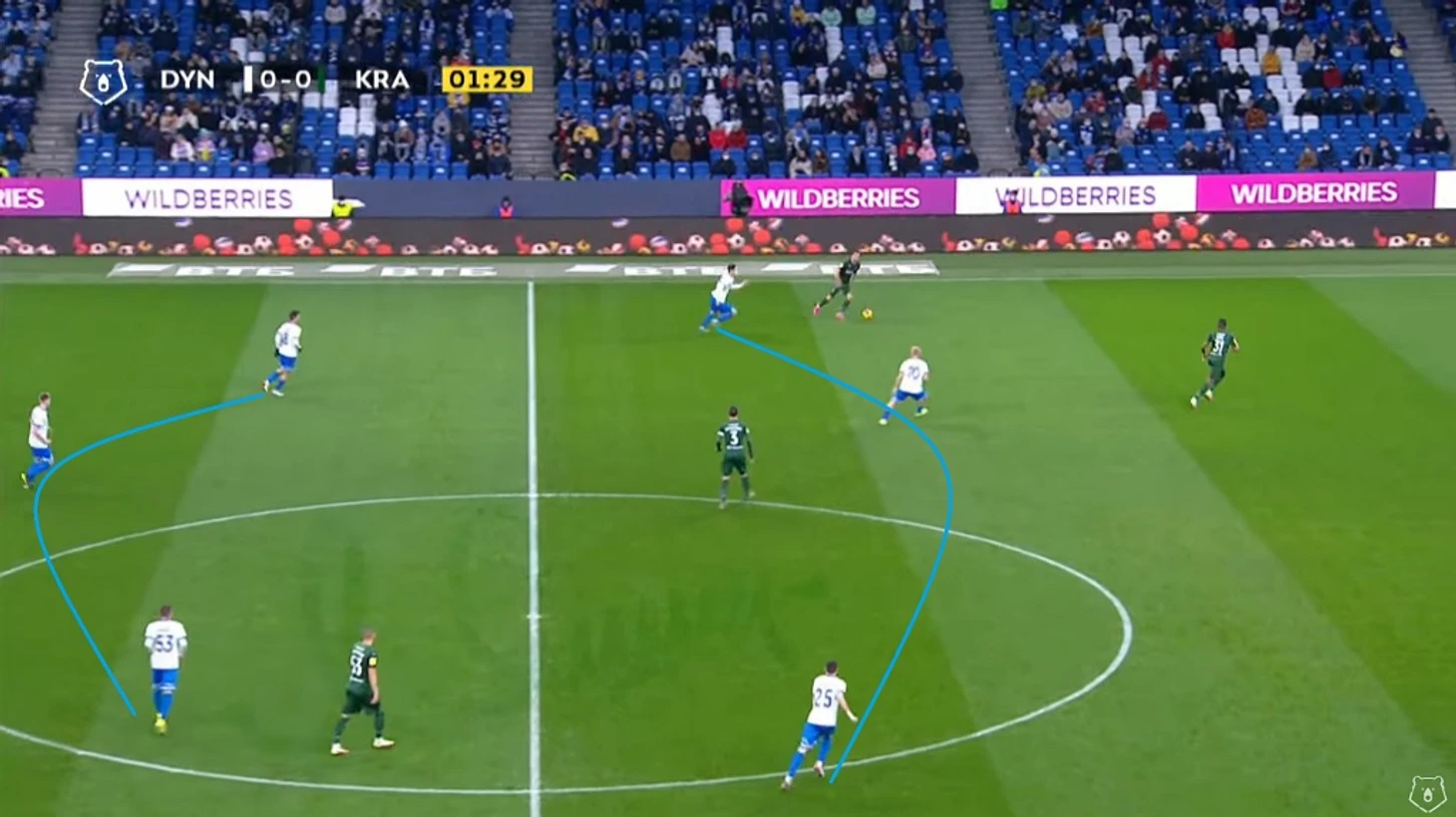В средней линии и произошла единственная значимая замена: вместо опытного Фомина в старте дебютировал Александр Кутицкий, у которого до этого матча было лишь три выхода на замену, а итоговое игровое время составляло всего 29 минут. Помогать Александру в центре будут привычные Шиманьски и Моро. В линии нападения никаких неожиданностей не произошло — Тюкавин по центру, Макаров справа, а Грулёв слева. Да, мы привыкли видеть Славу в центре нападения, но я хотел бы напомнить, что ещё в далёком 2015 году он начинал играть именно на позиции левого полузащитника, и даже сыграл 24 игры на этой позиции в юношеских и молодёжных сборных. Это уже потом, после того как Динамо так и не приобрело хорошего нападающего, он стал чаще играть в центре. И если количество игр на этих позициях у него приблизительно одинаково (44 слева, 41 в центре), то вот голов слева он забил значительно больше, чем играя центрального нападающего — 10 против 4. Как видите, стартовый состав был далёк от запасного. За исключением одного нового игрока это был нормальный боевой состав. Однако стоит ещё раз отметить, что единственная замена была сделана на очень ответственной позиции опорника, откуда мы частенько пропускаем голы. Поэтому лично для меня главным вопросом перед игрой было не «кто будет играть?», а «как будем играть?» и, в частности, «как сыграет новый игрок в центре полузащиты?». Так как против Зенита Шварц не стал менять игровую схему и играл в свой футбол, то и в этой встрече такое изменение было маловероятно. В завершении обзора составов добавлю, что к нам в гости приехал очень мотивированный соперник, так как в двух последних матчах они потерпели поражения от Кубани и Крыльев Советов. У Краснодара также было сделано две замены — Ионов вместо Кордобы в нападении и Спаич вместо Петрова справа в защите. Первый тайм. Кутицкий на первой же минуте вступил в игру, получив мяч от Шиманьского после отбора мяча на фланге. Александр не стал сразу обострять игру (можно было отыграть на Моро или Тюкавина), а сыграл надёжно и просто — обратно на Себу.