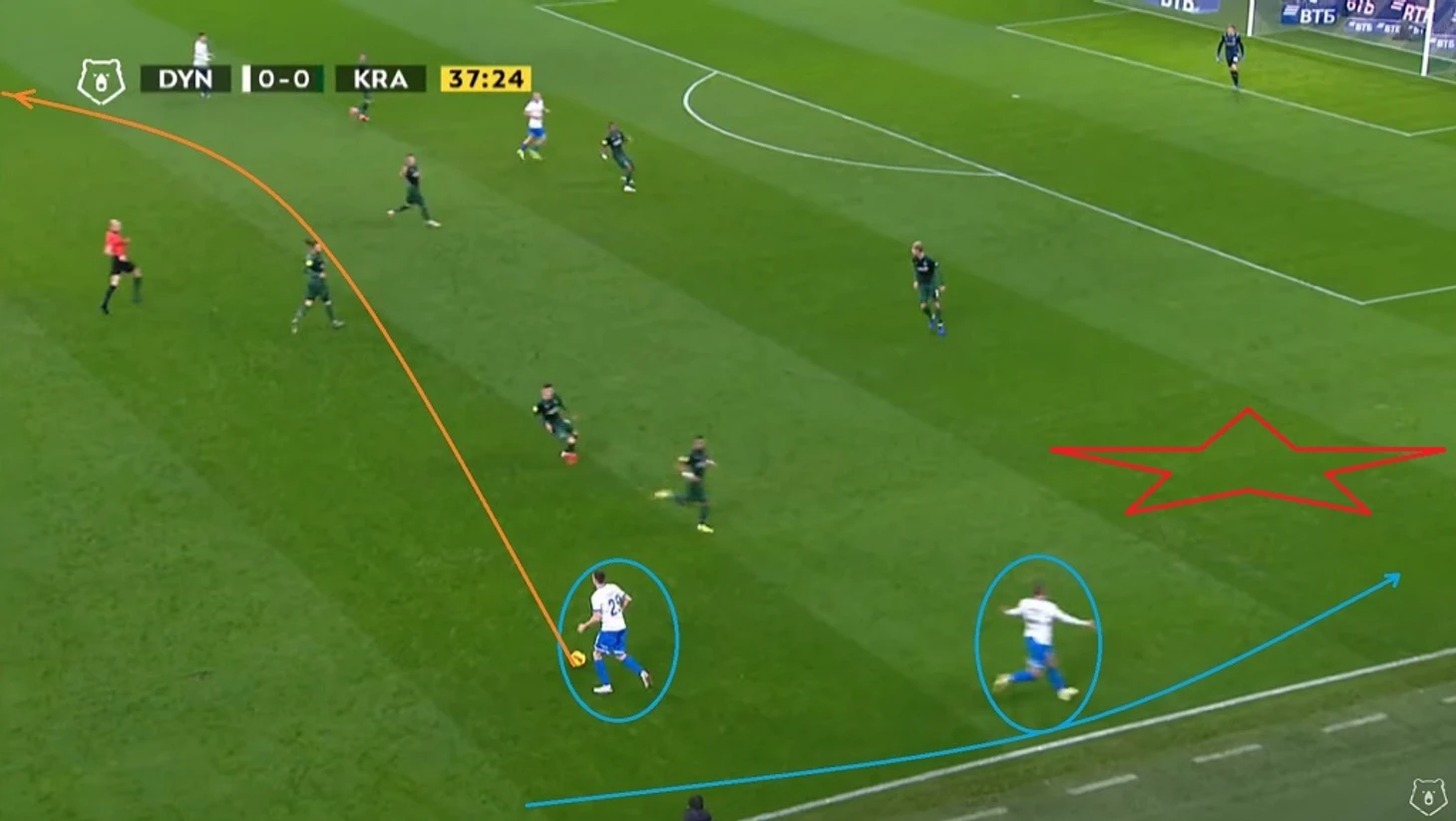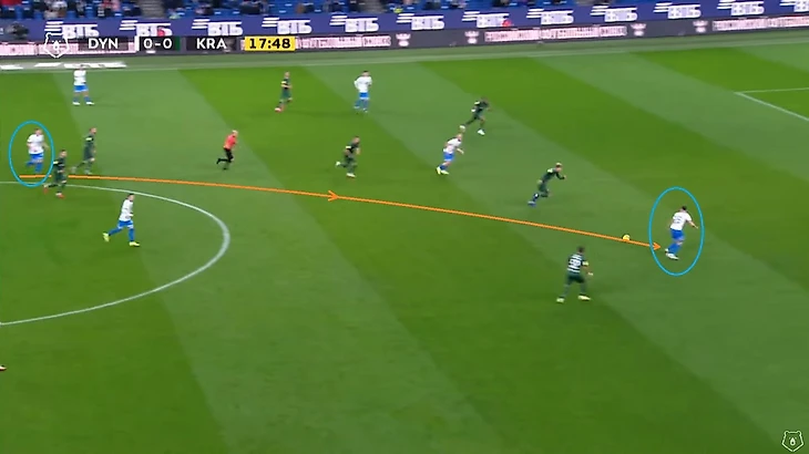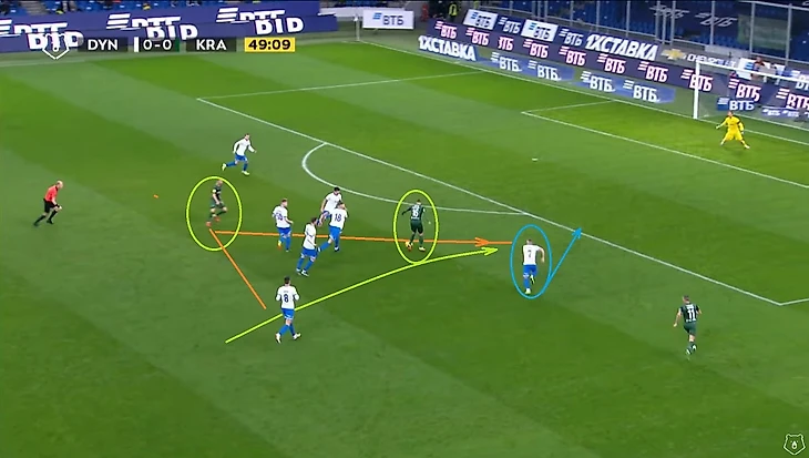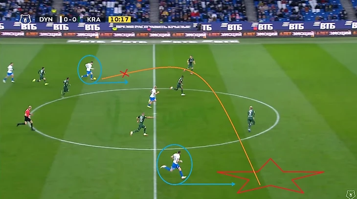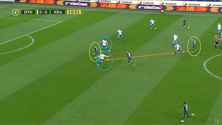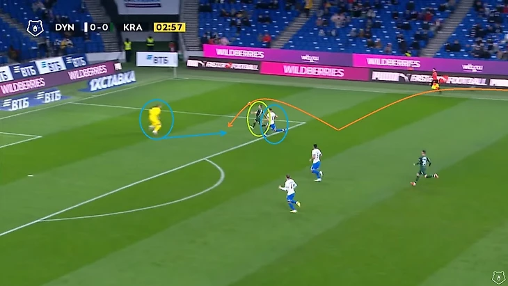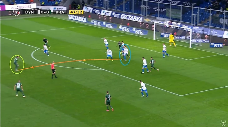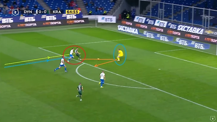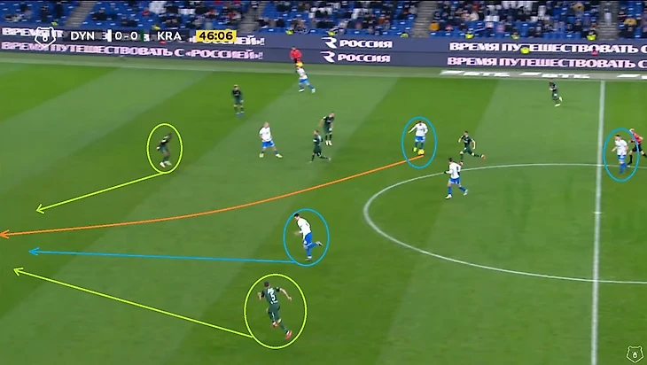 Возникновение подобных свободных зон непосредственно связано с моделью игры по-Шварцу. Вот, например, свою позицию минутой ранее оставляет Моро, чтобы усилить давление на соперника на его половине поля. Трудозатратно и малоэффективно для атаки, но полезно для обороны — у Крыховяка меньше времени на обработку мяча и принятия решения.