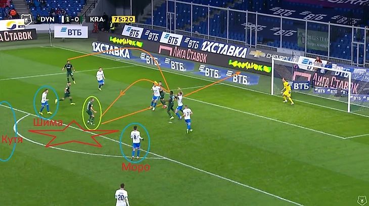 Но даже этот эпизод никак не встряхнул наших игроков и Краснодар продолжил играть первым номером. Динамо же, даже получая возможности для контратак, никак не могло до верного разыграть мяч, греша частыми потерями и неточными передачами. Вот здесь, что помешало Грулёву осмотреться и отдать пас на свободного Шиманьски? А ведь это не в первый раз в этом матче, когда Слава не видит партнёров.