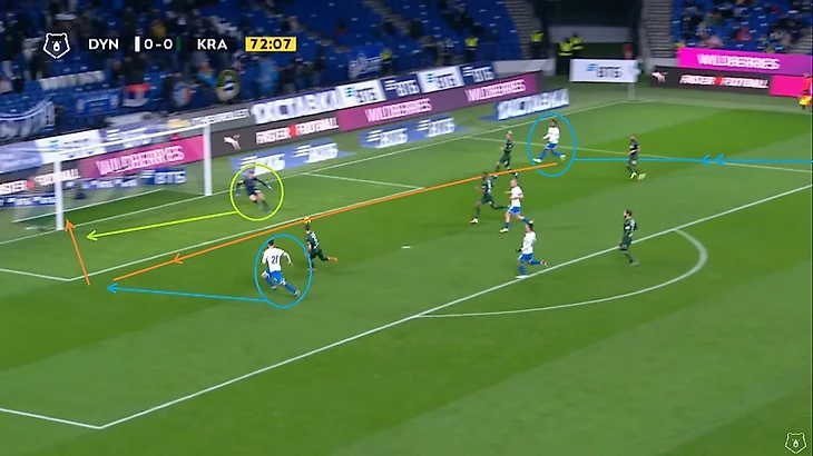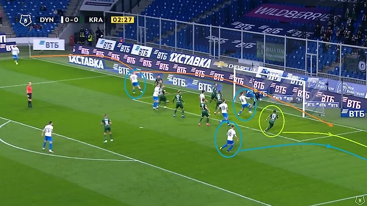 Первый момент не заставил себя долго ждать: типичный угловой на ближнюю штангу, скидка на дальнюю и лишь Моро не дотягивается до мяча, чтобы переправить его в пустые ворота. Удивительно, как раз за разом соперники позволяют нам разыгрывать такие угловые. Обратите внимание на положение нашего номера 50 — после углового он прессинговал соперника, и если бы не брак в обработке мяча Макаровым, то мяч остался бы у нас.