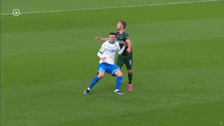 Начало игры получилось достаточно интересным, и вот Динамо снова атакует левым флангом, но у Грулёва не получается навес в район 11-ти метров. Три потенциальные атаки с обеих сторон за 5 минут — выглядело многообещающим. В начале я настроил болельщика на позитив, немного рассказав о Паршивлюке, но вот в первом своём моменте он не смог укротить мяч. К счастью, отлично сработала наша подстраховка и Бальбуэна сильным выносом бросает в атаку Тюкавина. Костя слегка оттесняет лицо соперника рукой и мяч переходит к гостям.