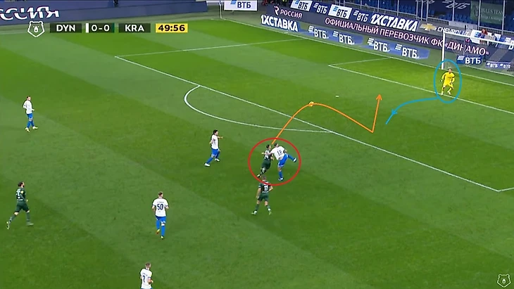 Краснодар сразу же ответил забросом за Ордеца, но вовремя вышедший из ворот Шунин не позволил Ионову нормально обработать мяч, который в итоге ушёл на угловой. Этот заброс напомнил мне забросы Зенитом туром ранее. Сказывается отсутствие как и скорости у Ордеца, так и вездесущего Диего Лаксальта. Зато головой Ордец играет надёжно и никакой пользы из этого углового гости не извлеки.