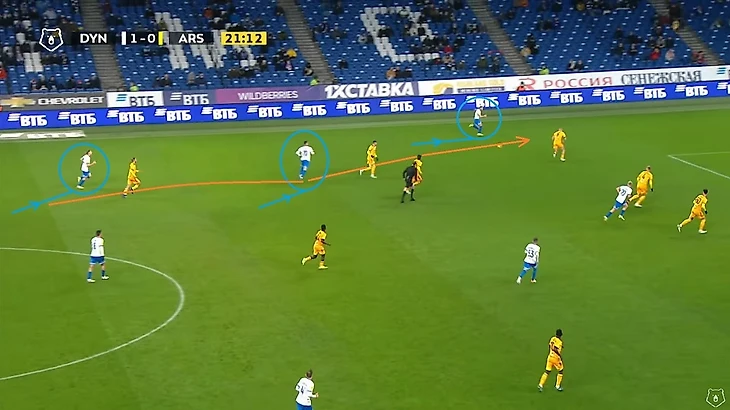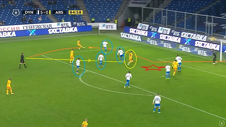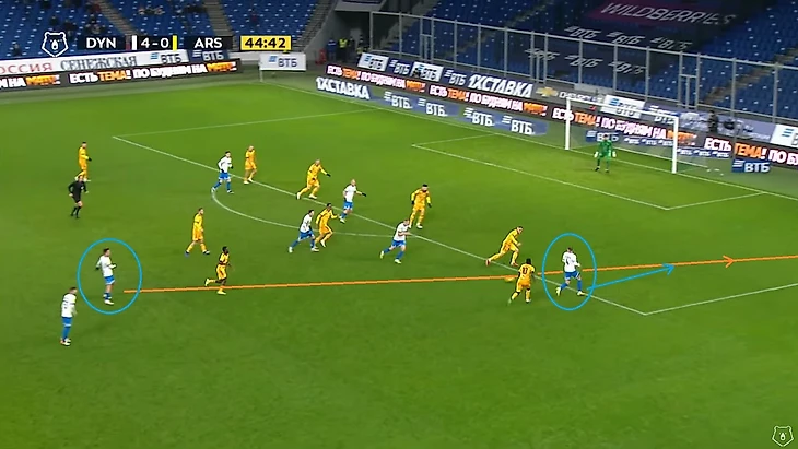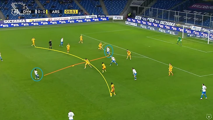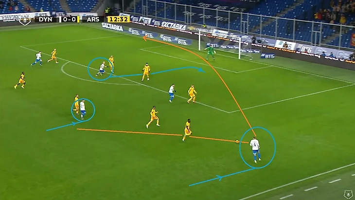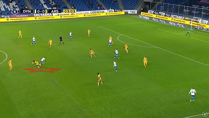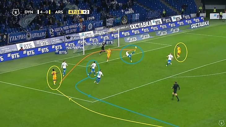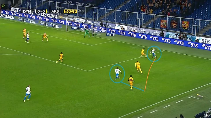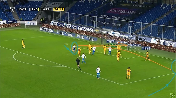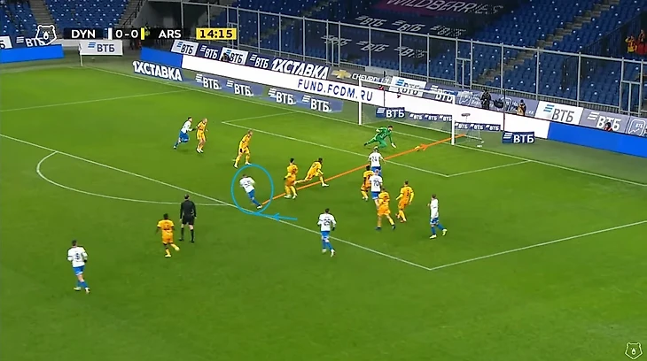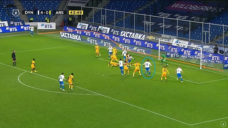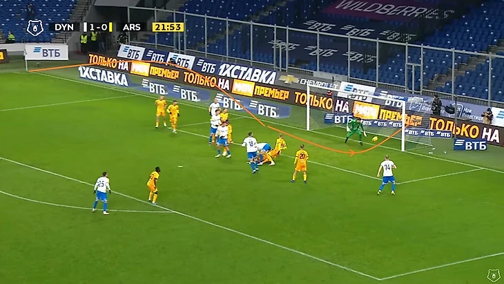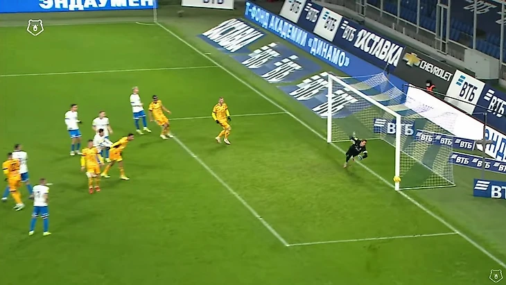 После подачи Шиманьски Бальбуэна продавливает соперника и пробивает точно под правую штангу, открывая свой голевой счёт за московское Динамо. А вот вратарь Арсенала снова играет очень пассивно, провожая взглядом пересекающий линию мяч.