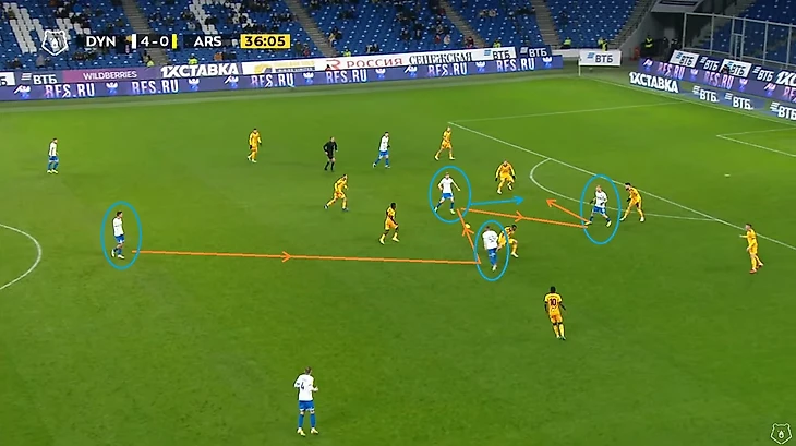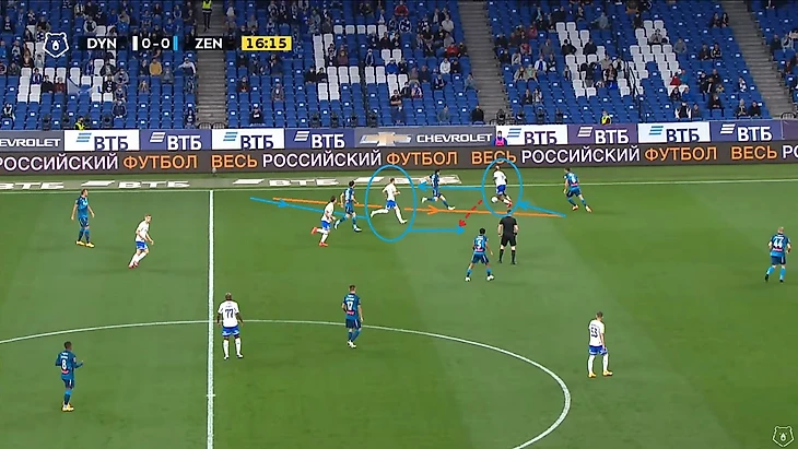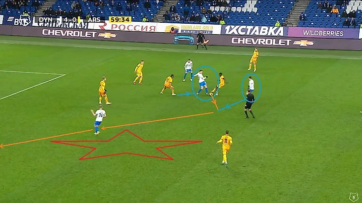 А вот моя любимая комбинация, которая вначале работы Шварца как-то исчезла из арсенала команды (ну она и до него была редкой), но с началом нового сезона розыгрыш мяча по центру не просто вернулся, но и вышел на новый уровень. Как я уже отмечал, вначале работы Сандро делал упор на силовой и индивидуально-скоростной футбол, но после второго сбора команда всё чаще и чаще разыгрывает мяч таким образом, при чём на любом участке поля.