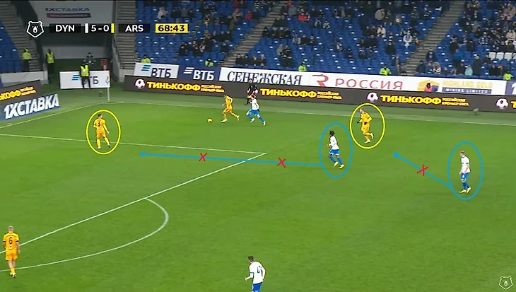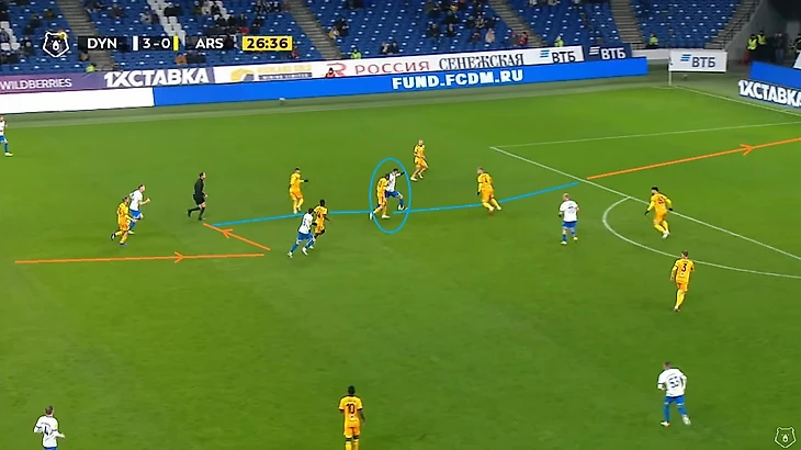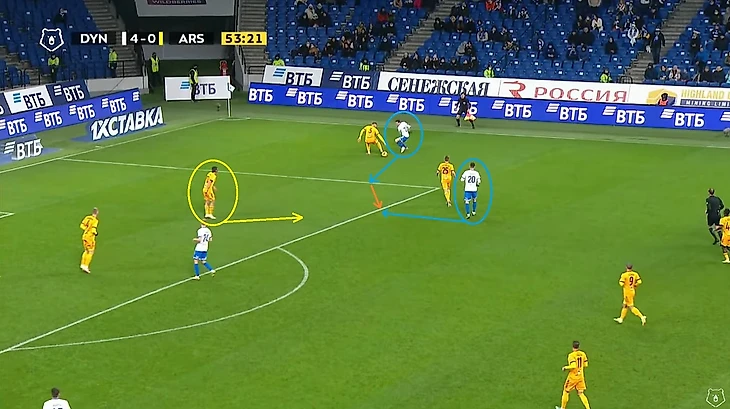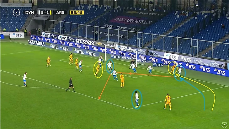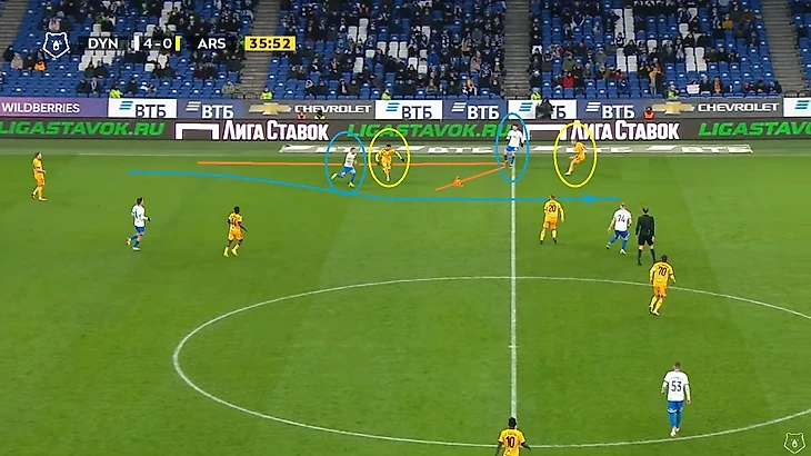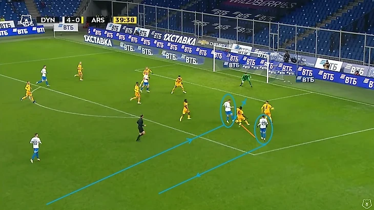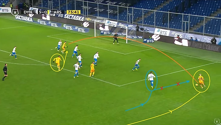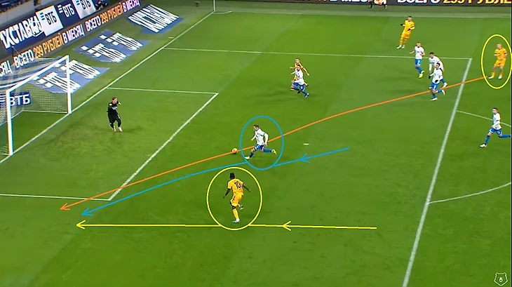 После углового Арсенал снова пытается убежать в контратаку, а Кангву всё также преследует Макаров, тем самым давая возможность и другим игрокам вернуться в защиту. Одним из таких вернувшихся был Скопинцев, красиво в падении прервавший опаснейшую передачу на одинокого соперника.