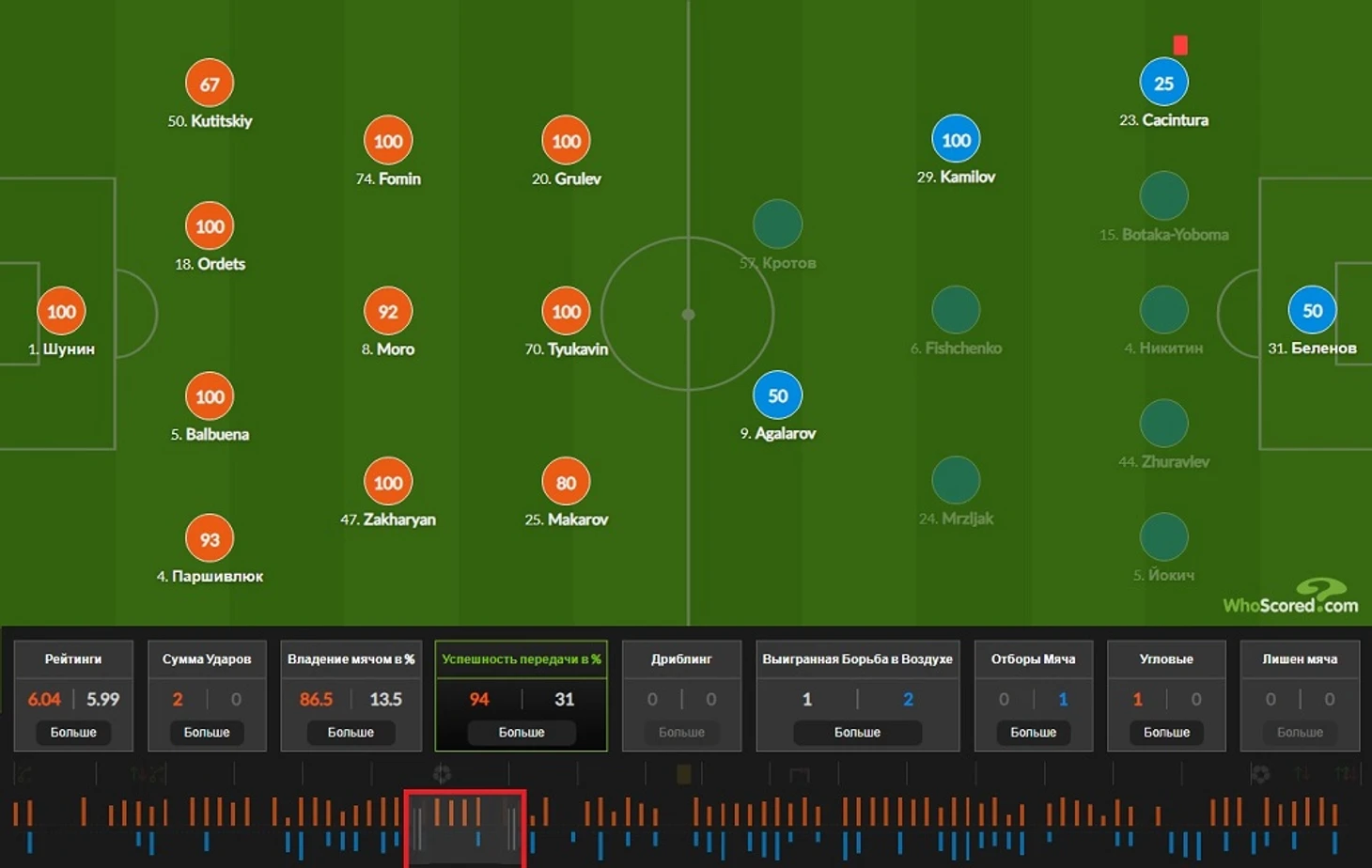К 20 минуте мы подали несколько угловых, многие из которых по наигранной схеме на ближнюю штангу — увы, без должного результата, однако некое беспокойство в защите Уфы всё же присутствовало. Несмотря на большое преимущество по владению мячом (80% против 20%), и наши игроки иногда допускали ошибки. Так, например, в течение 10 секунд сначала Фомин отдал мяч сопернику, а затем и Захарян неточно сыграл пяткой. Отмечу также, что всё это происходило на нашей половине поля. И ещё раз о владении мячом в первые двадцать минут: более половины из всего владения приходились на наших защитников: