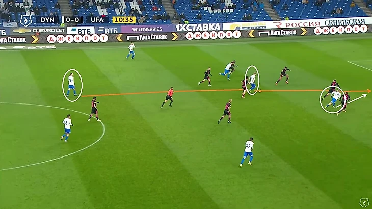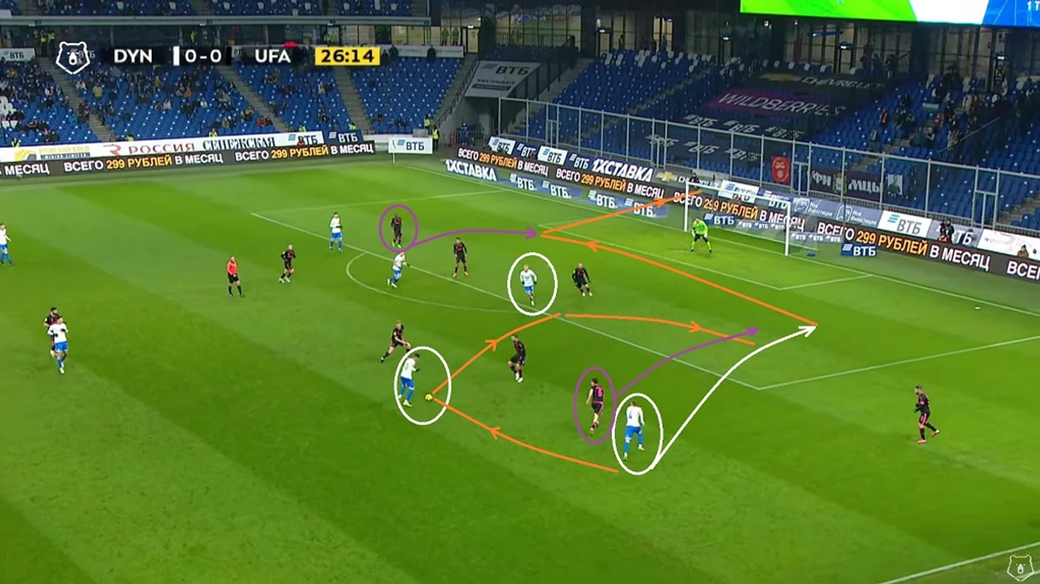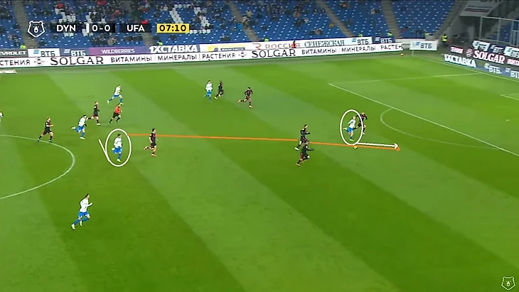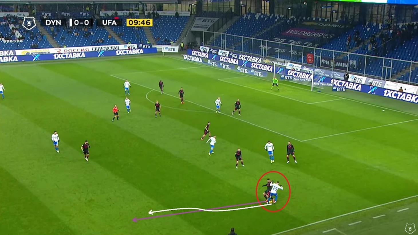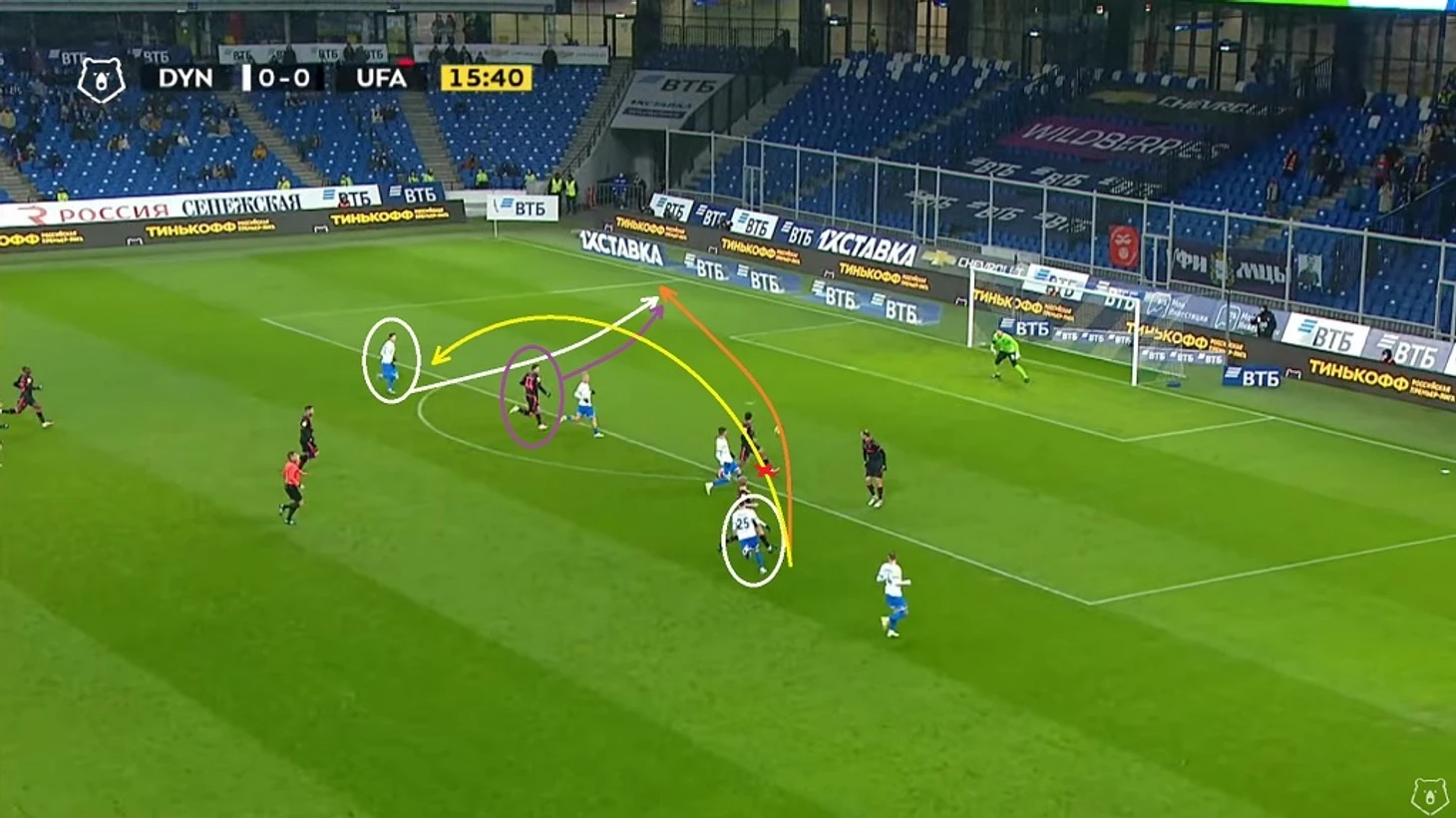 Хозяева ненадолго обосновались на половине соперника, частенько перепасовываясь возле центрального круга. Атака без скорости является ещё одной слабостью Динамо, над которой работает весь тренерский штаб. Пока единственным решением, эффективно работающим в этом случае, являются разрезающие передачи, которыми наши игроки и пользовались время от времени. А вот и пример того, к чему могут приводить атаки без скорости — защитник Уфы накрывает Макарова, следует потеря и вот уже Уфа контролирует мяч.