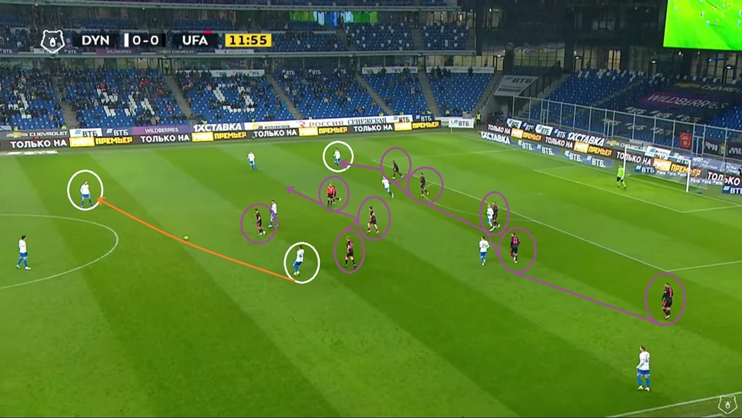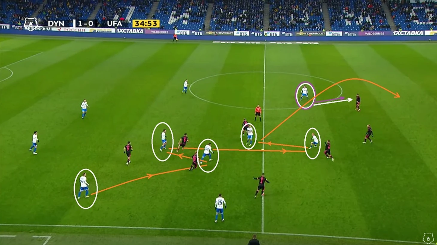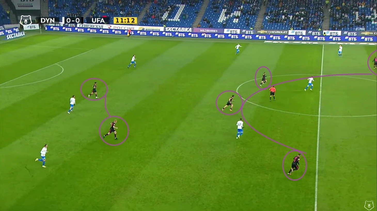 Забитый гол придал сил и эмоций нашим игрокам, а нога Шиманьски определённо пошла на поправку. Динамо несколько минут оказывало постоянное давление на оборону Уфы, а одним из самых активных в эти минуты был Арсен Захарян, при этом процент успешных передач у всей команды составлял 94%: