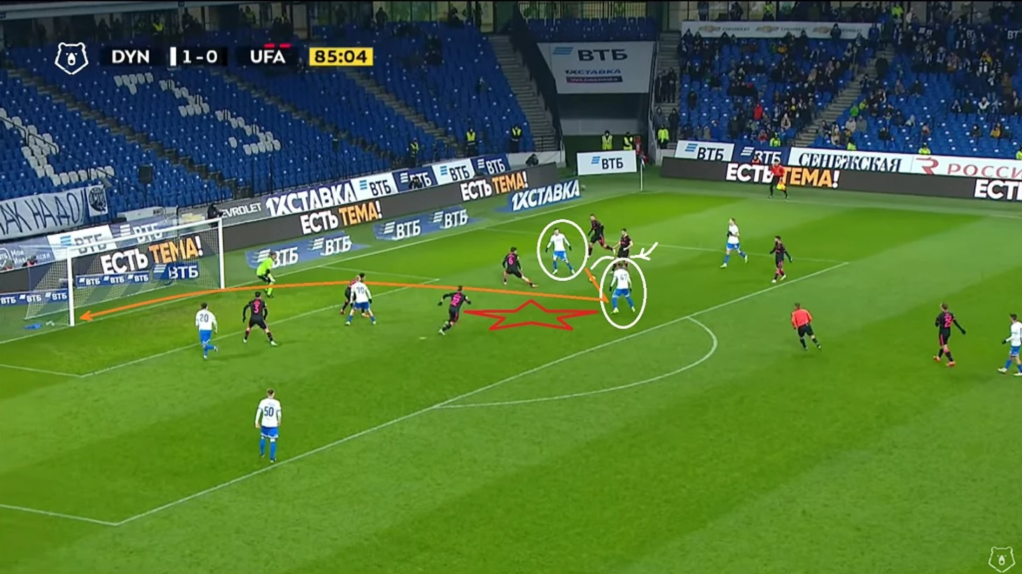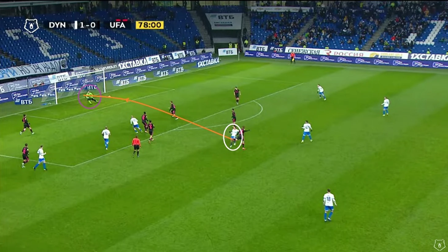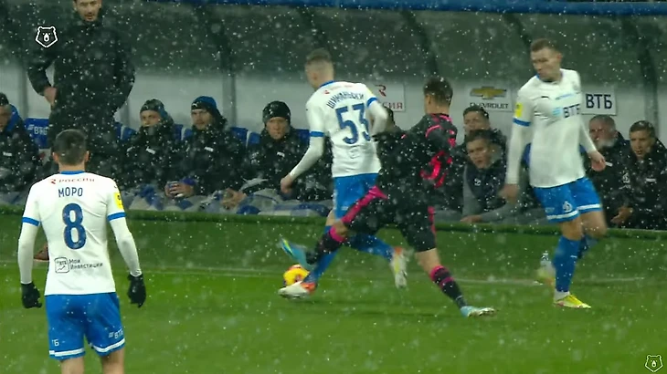 Всё это не могло не сказаться на игре Уфы, а в итоге привело к тому, что Касинтура небрежно сыграл против Грулёва и был удалён за фол «последней надежды». Я же отмечу как прямо перед этим динамовцы красиво раскатали гостей пасами в одно касание: