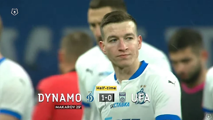 К первому тайму было добавлено четыре минуты, в которые кроме неточных ударов Динамо и предупреждения Грулёву ничего примечательного не произошло. Хотя нет, свисток на перерыв прозвучал после редкой атаки Уфы…