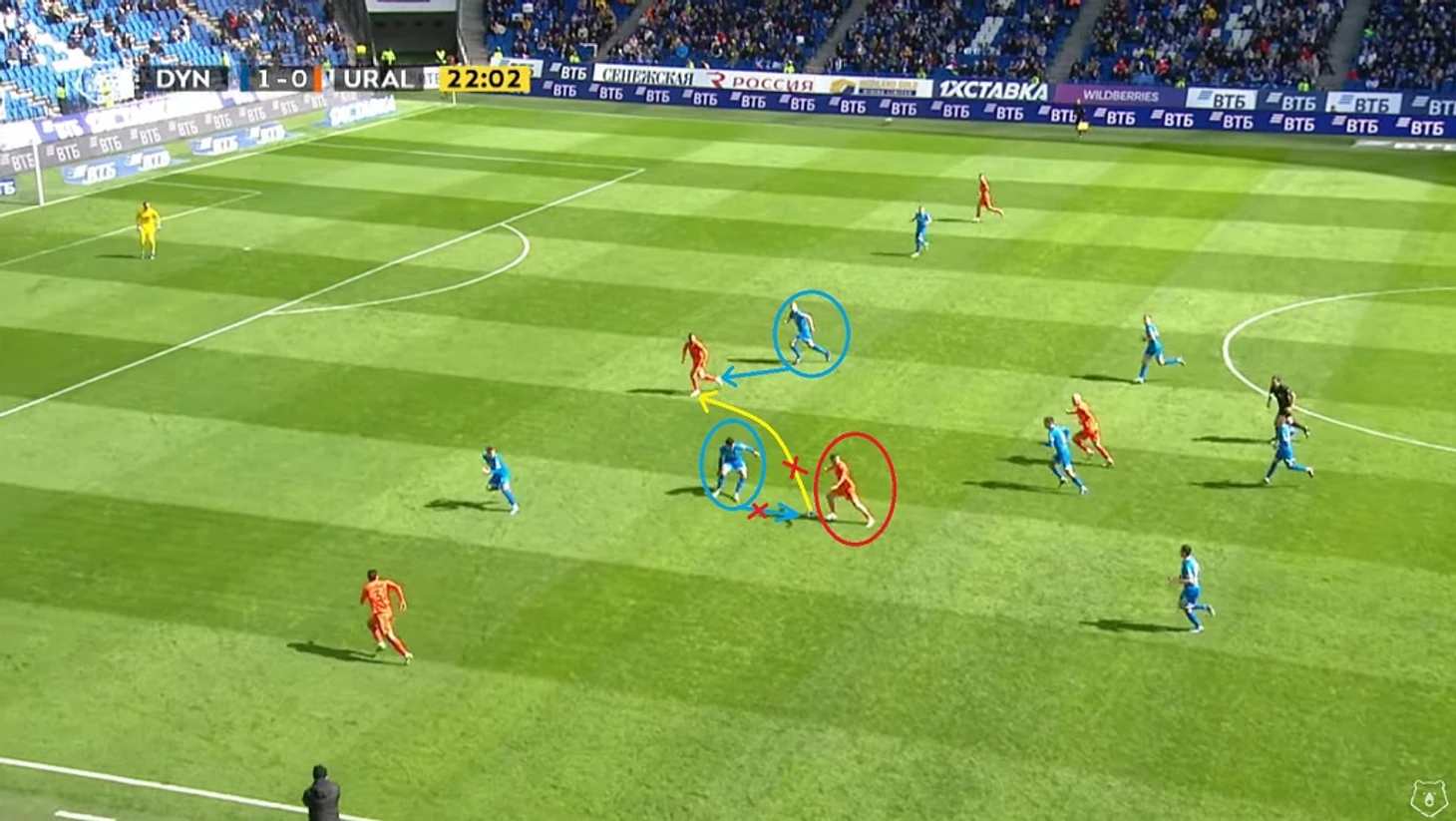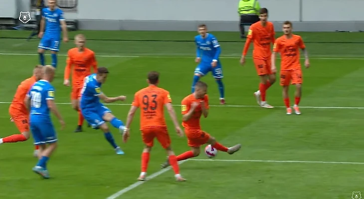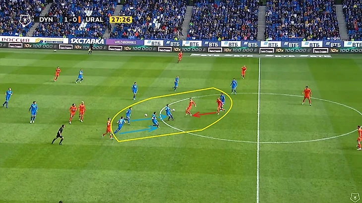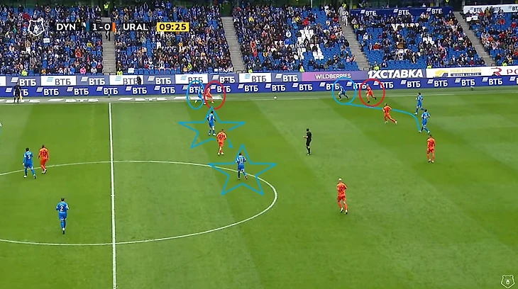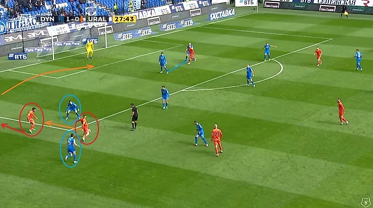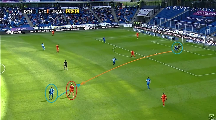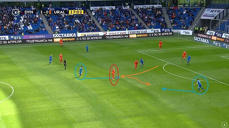 В следующем эпизоде отличились Фомин и Скопинцев. Первый вынудил своим давлением пнуть мяч за боковую, а второй сопровождал своего игрока на тот случай, если бы пас у соперника получился бы. Обратите внимание на расположение и наших нападающих и опорников — к этому моменту мы ещё вернёмся после 25-ой минуты…