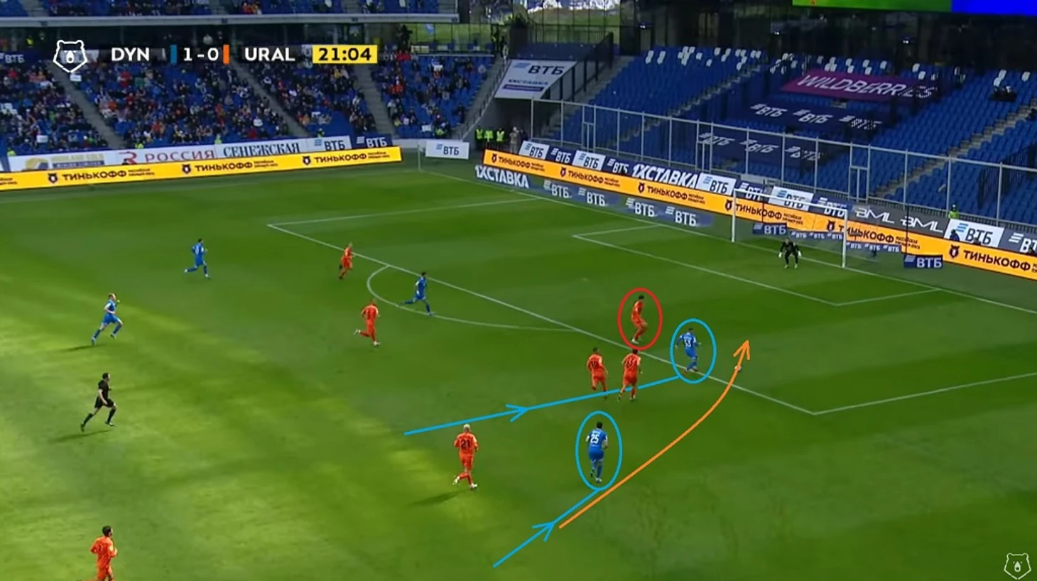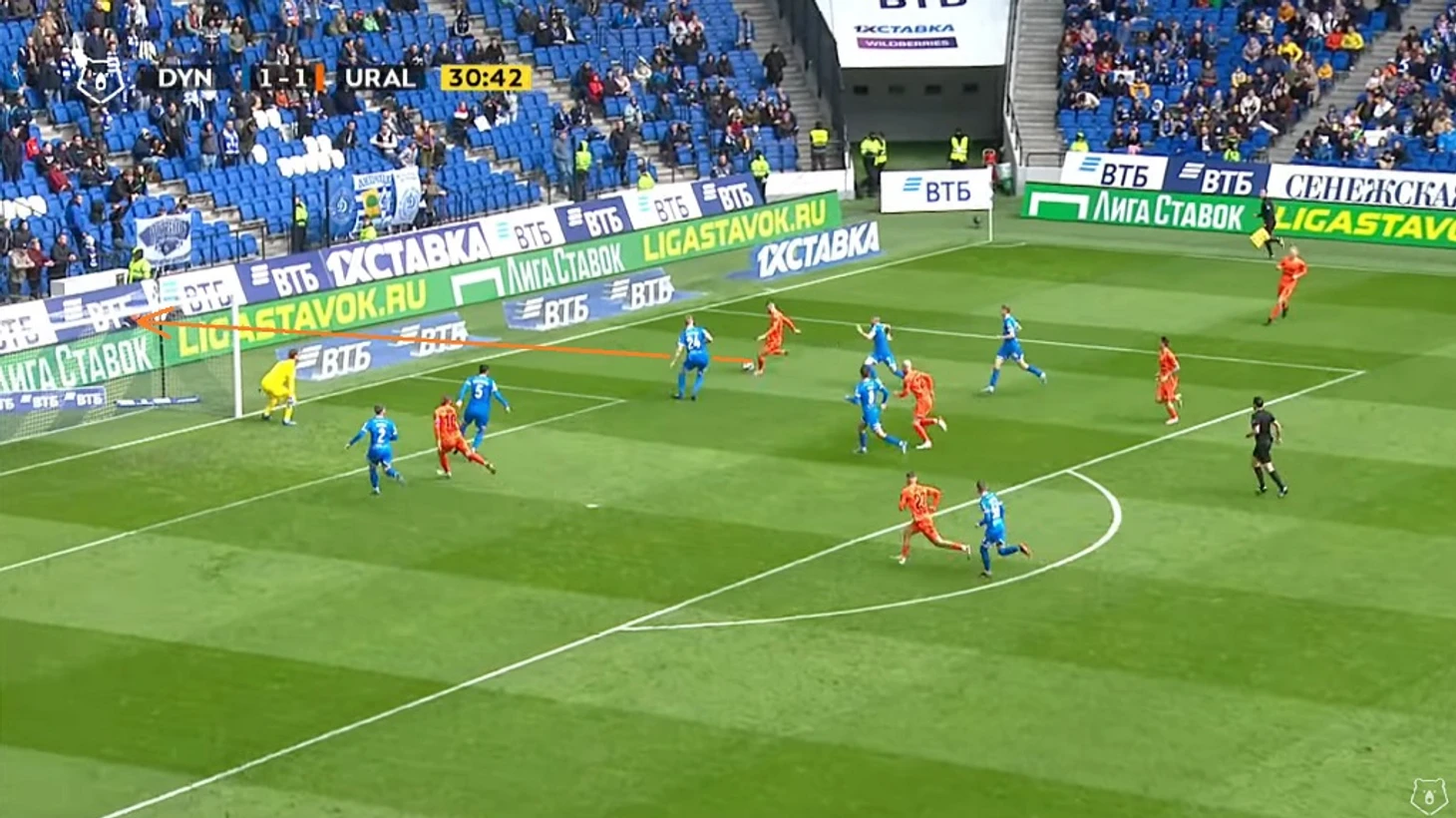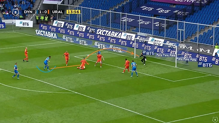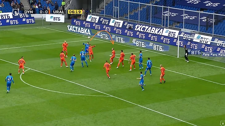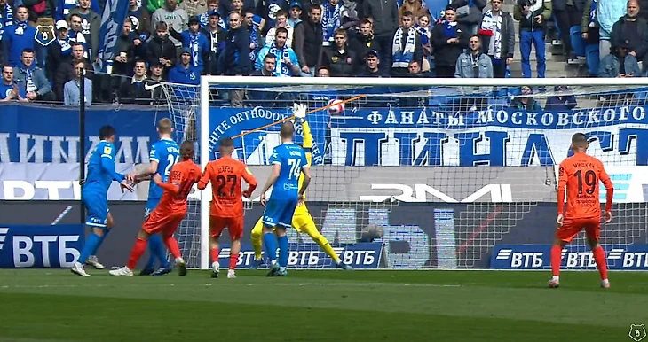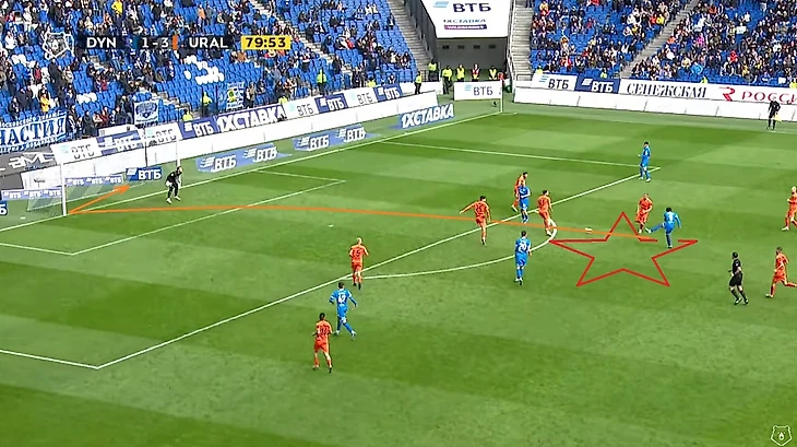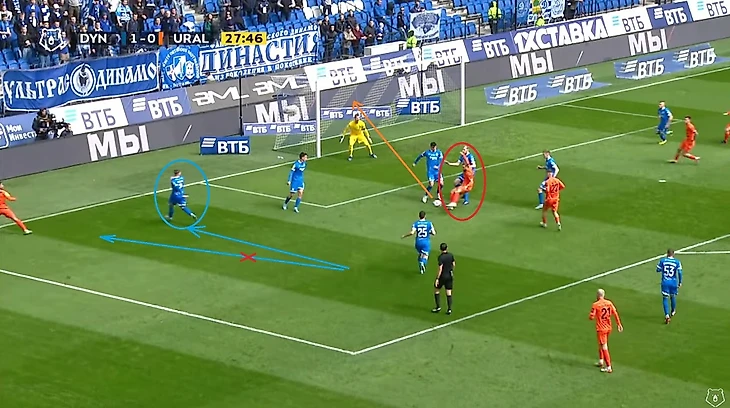 Пусть Моро и не коснулся мяча, однако именно после прессинга хорвата мяч не только перешёл под наш контроль, но также мы провели и пару хороших атак, одна из которых завершилась опасным ударом Фомина, а вторая голом Захарян после углового — 1:0. Как вы уже поняли, я не только обращаю внимание на всю цепочку наших ошибок, но также и на все детали наших атак. Кстати Моро же выиграл одну верховую дуэль в голевом эпизоде.