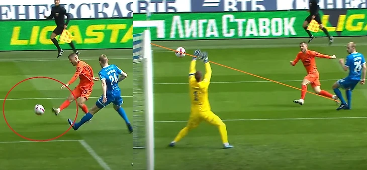 Для сравнения игра Сафонова — на тех же присогнутых ногах и в обоих случаях Матвей свою команду спас.