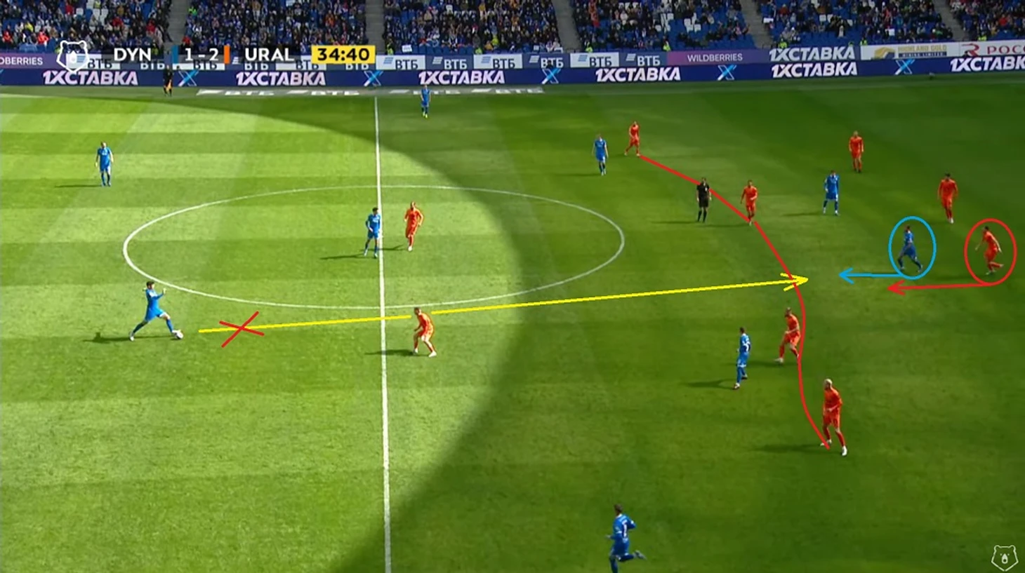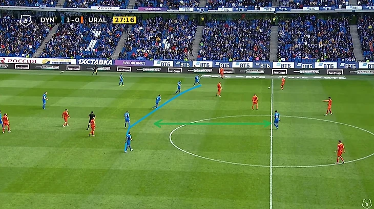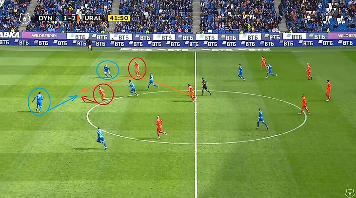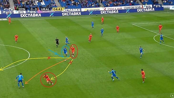 Ну а серию «плотной игры по своему игроку» я завершаю эпизодом на 42-ой минуте. Как видно на фото вначале Скопинцев не успевает к своему игроку, после чего тот без помех отдаёт пас в центр, где уже на своего соперника грамотно выдвигается Бальбуэна. Это фото идеально демонстрирует важность накрытия своих оппонентов и игры на опережение: в одном микроэпизоде мы позволяем сопернику развивать свою атаку (Скопинцев), а в другом микроэпизоде эту атаку мы прерываем (Бальбуэна).