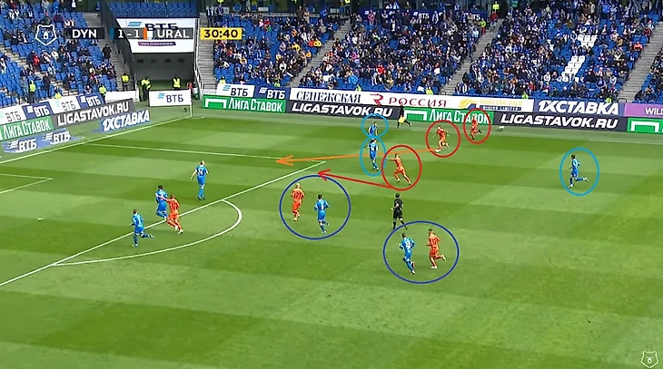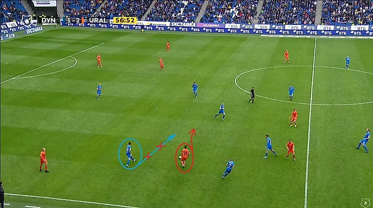 До свистка на перерыв оставалось чуть больше десяти минут, но у себя в блокноте я лишь отметил обострения игры от Захаряна и Скопинцева слева, и неточный удар головой Евгеньева после углового. А вот Урал стал обороняться так же, как и мы в первой половине первого тайма: плотная опека своего игрока. Иногда защитник может накрывать оппонента не после паса, а до него, просто сделав несколько шагов в его сторону. И тогда у атакующей команды пропадёт желание пасовать в борьбу, как на фото ниже: