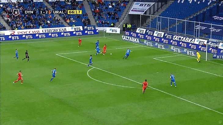 Урал смотрится гораздо целостнее, отлично контролирует мяч, передачи следуют точно в ноги. Редкая ошибка Моро приводит к опасному удару по воротам Шунина — на этот раз в метре от штанги. Сразу после этого Шварц к моему удивлению меняет более-менее активного Макарова, у которого, я уверен, ещё остались силы и он мог ещё бы побороздить правую бровку… Тем временем Смолов продолжает просто находиться на поле: