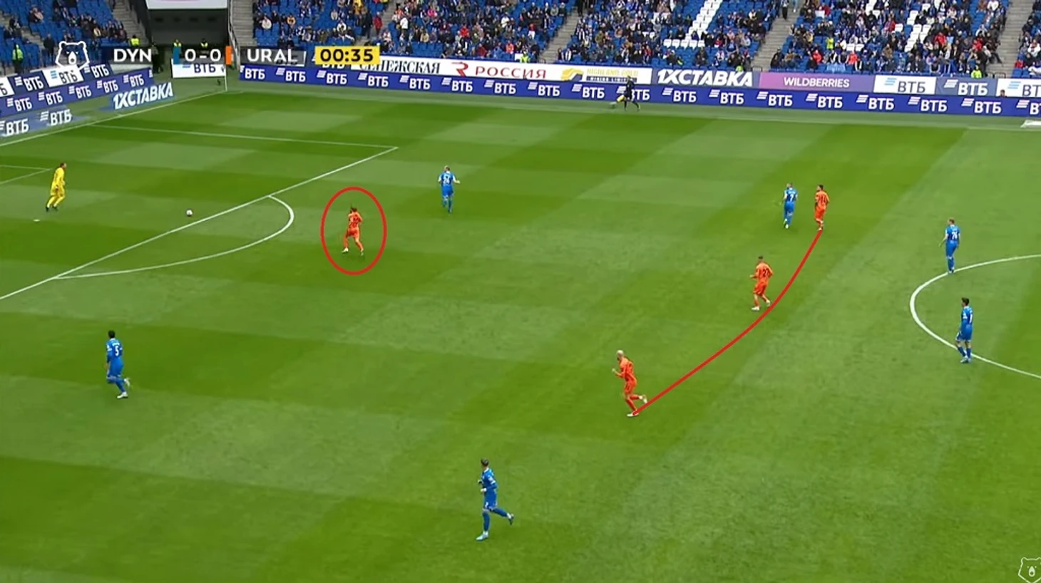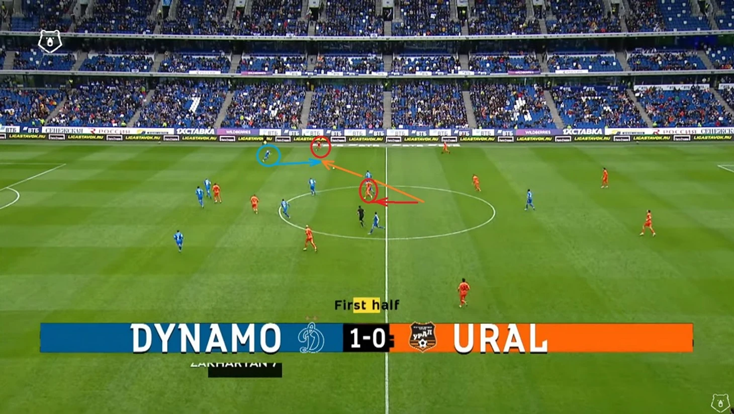 Первые пять минут первого тайма потребовались командам, чтобы заиграть в свою игру. Вначале бросилось в глаза очень высокое расположение игроков Урала. Гости словно знали, что мы испытываем проблемы в игре против команд, глубоко садящихся в оборону (Нижний Новгород), или играющих так же, как и мы — высоко встречая соперника на его половине поля (Ростов). При этом когда мы прессинговали соперника, то уральцы не без труда, но всё же выходили из-под давления.