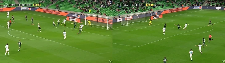 С нашей стороны сначала приятно удивил Смолов, нестандартно отпасовавший на забегающего Варелу в штрафной площади. Увы, Гильермо не хватило длины поля, но задумка была хорошей. Затем Моро продемонстрировал общий настрой команды, а именно внимательную и плотную игру по сопернику. Только за первый тайм я насчитал пять моментов похожих на эпизод, за который я отчитывал Бальбуэна в прошлом разборе. Посмотрите, если бы Никола не рванул к своему игроку, то у оппонента было бы больше времени на обработку мяча и выполнение точного паса на Бикфалви. А так — точная передача в Бальбуэну.