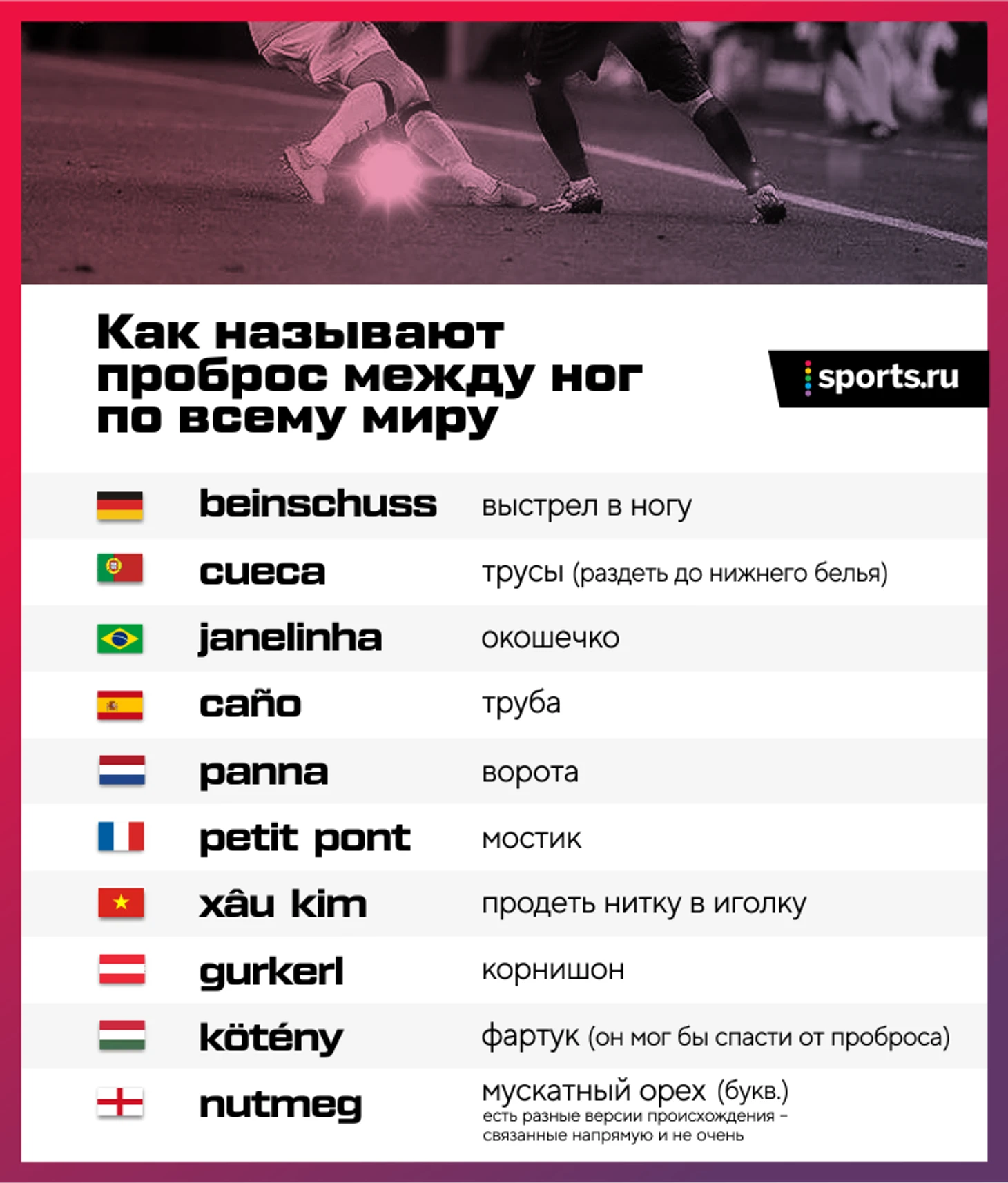 Проброс между ног – высшая форма превосходства атакующего игрока над обороняющимся. Кем бы ни был бедняга и на каком языке он бы ни говорил, всегда найдется особое словечко, подчеркивающее его унижение. В Германии такой обыгрыш сравнивают с выстрелом в ногу, в Португалии – с раздеванием до трусов, а в Венгрии советуют надеть фартук. Если такое случалось с вами, вам наверняка сообщали, сколько копеек вы должны – конечно же, настоящих денег никто не брал, ведь с вас и так уже достаточно. Самыми милосердными кажутся вьетнамцы: «продеть нитку через ушко иголки» – редкий случай, когда оценивается мастерство.