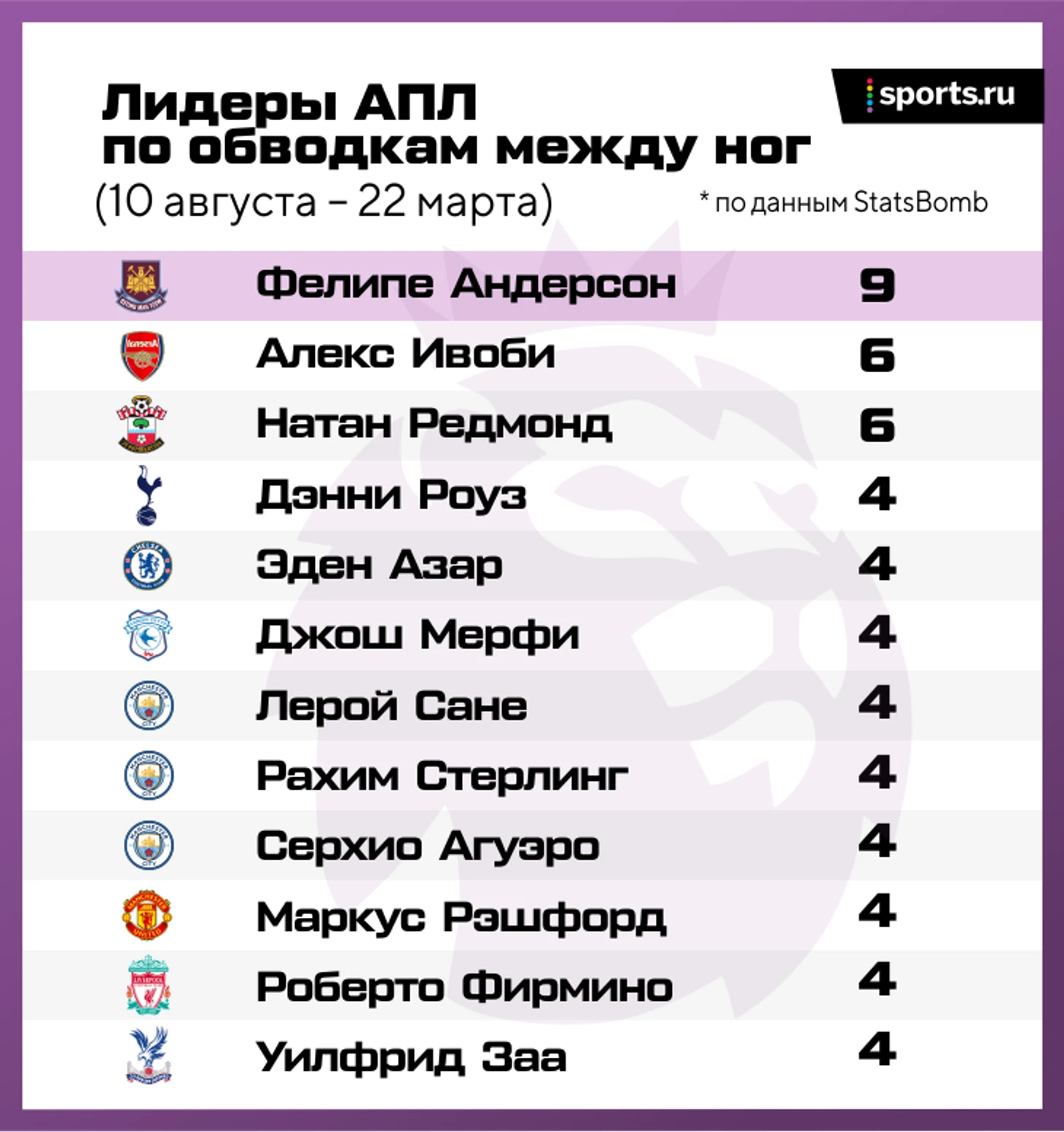 В открытом доступе данных по таким ободкам нет, но парни из StatsBomb периодически выкладывают в твиттер цифры по Англии. Последнее обновление было 22 марта. Лидерство Андерсона предсказуемо: