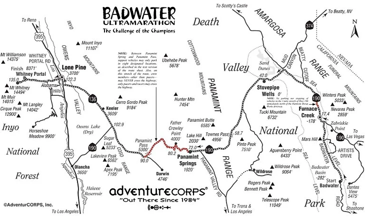 Ультрамарафон «Бэдуотер», старт которого намечен на 19 июля, организаторы называют «самым сложным забегом в мире», и на то есть все основания: дистанция 217 километров, старт из впадины (86 метров ниже уровня моря) и финиш на склоне горы Уитни (2548 метров); а проводится забег в середине июля, когда в Долину Смерти приходят экстремальные температуры – до 54 °С.