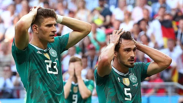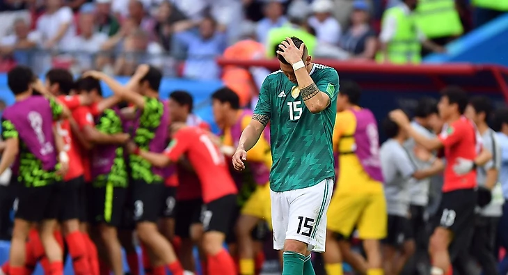 Сборная Германии на чемпионате Мира 2018 года — это зазнавшийся чемпион, который на основании прошлых побед не воспринимает всерьез никого и подходит к спортивным состязаниям снисходительно. Судьба сборной Германии на чемпионате Мира 2018 — это спортивная драма, в которой немцы — не главный герой, преодолевающий препятствия при восхождении на «олимп», а наоборот — антипод главного героя — верзила, который ни во что не ставит соперника и думает о своем непоколебимом чемпионстве, как об очевидном факте. Несмотря на поражение в первом матче от мексиканцев и «отскок» в матче со шведами, чрезмерная заносчивость команды Йоахима Лёва крепчала на глазах. В матче со сборной Южной Кореи, Германия выступала в роли Джеймса «Клаббера» Лэнгиза, из фильма Рокки 3, а корейцы в роли самого Рокки Бальбоа. Те, кто смотрел третью часть эпопеи Рокки, поймут это сравнение. Немцы владели мячом на протяжении всего матча, но на последних минутах, в духе голливудского кинофильма, корейцы переломили ход встречи и забили гол на 90 минуте, а на 96 минуте, азиатская команда добила немцев и сделала счет в матче 2:0. Сборная Южной Кореи радовалась этой победе так, словно она что-то для нее значила, и команда оказалась в 1/8 чемпионата Мира по футболу. Это не удивляет, ведь до начала матча, в этой паре был явный аутсайдер — сборная Южной Кореи. Корейцев никто не воспринимал всерьез, в том числе и сами немцы. К этому сопернику сборная Германии готовилось спустя рукава и это было видно на поле Казань Арены.