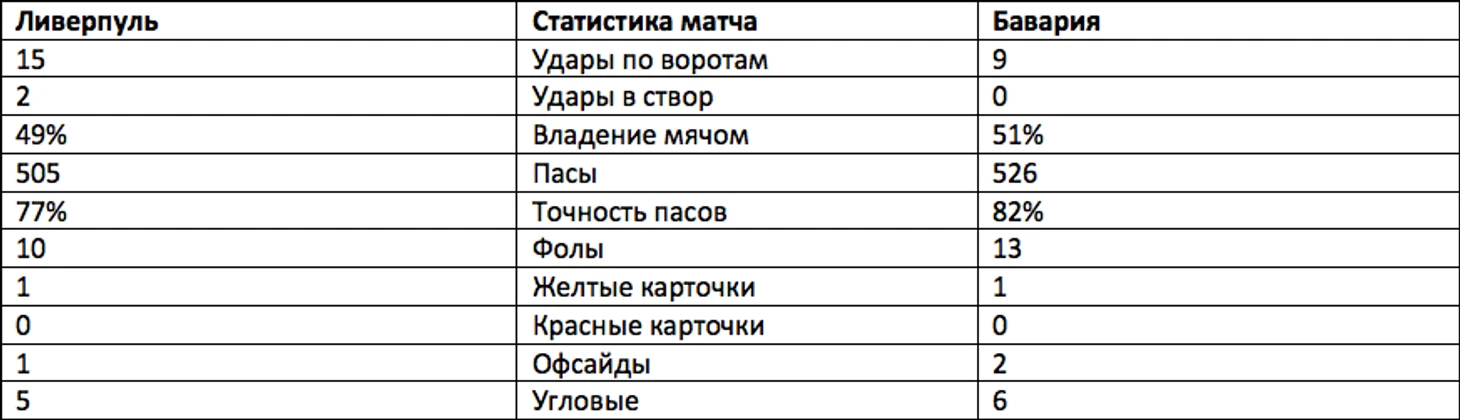Таблица 1. Первый матч. Энфилд. Ливерпуль-Бавария. 19 Февраля 2019 года