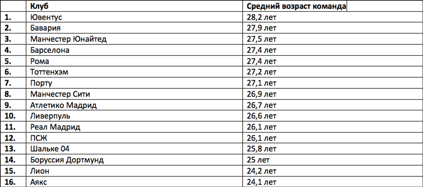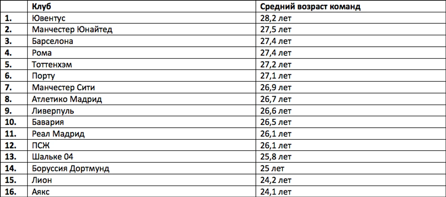 Наверное, глядя на эту таблицу, у вас возникнет мысль: “О чем говорит автор, если средний возраст мюнхенской команды и близко не располагается к тройке самых возрастных команд 1/8 финала?”. Вы, конечно же, будете правы, но давайте смотреть правде в глаза, если в расчет брать только тех игроков, которые получали реальное игровое время в текущем еврокубковом сезоне, то ситуация будет следующая: