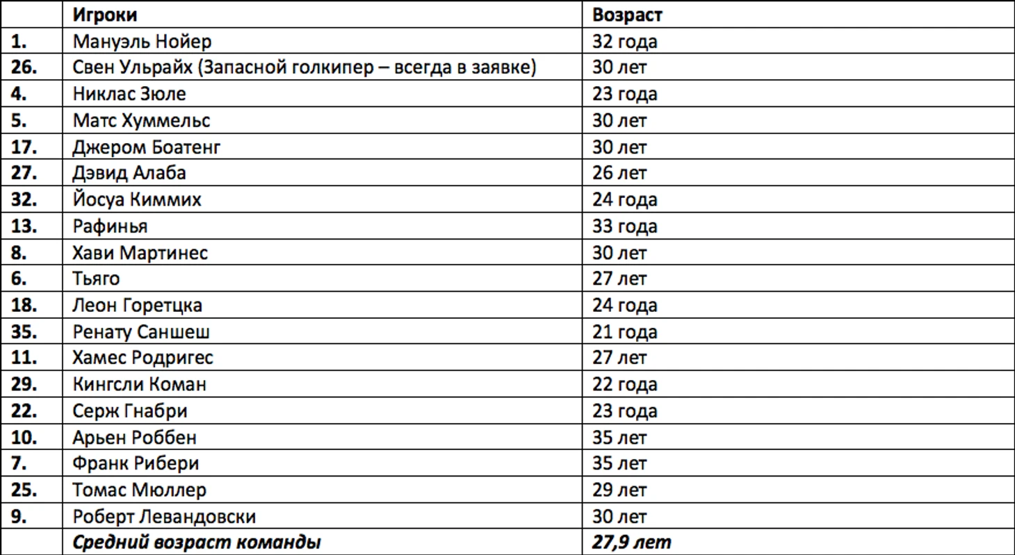 Средний возраст команды: 27,9 лет! А теперь, давайте взглянем на таблицу №1, с обновленными в результате нашего исследования данными по мюнхенскому клубу: