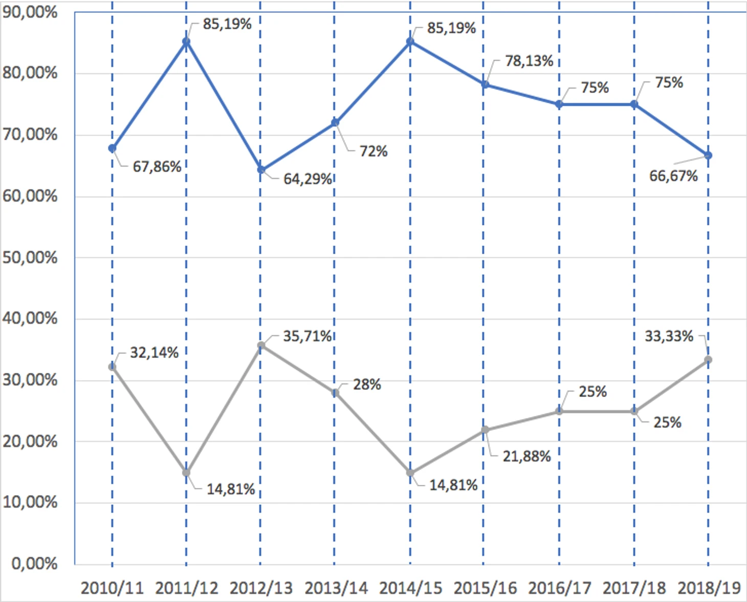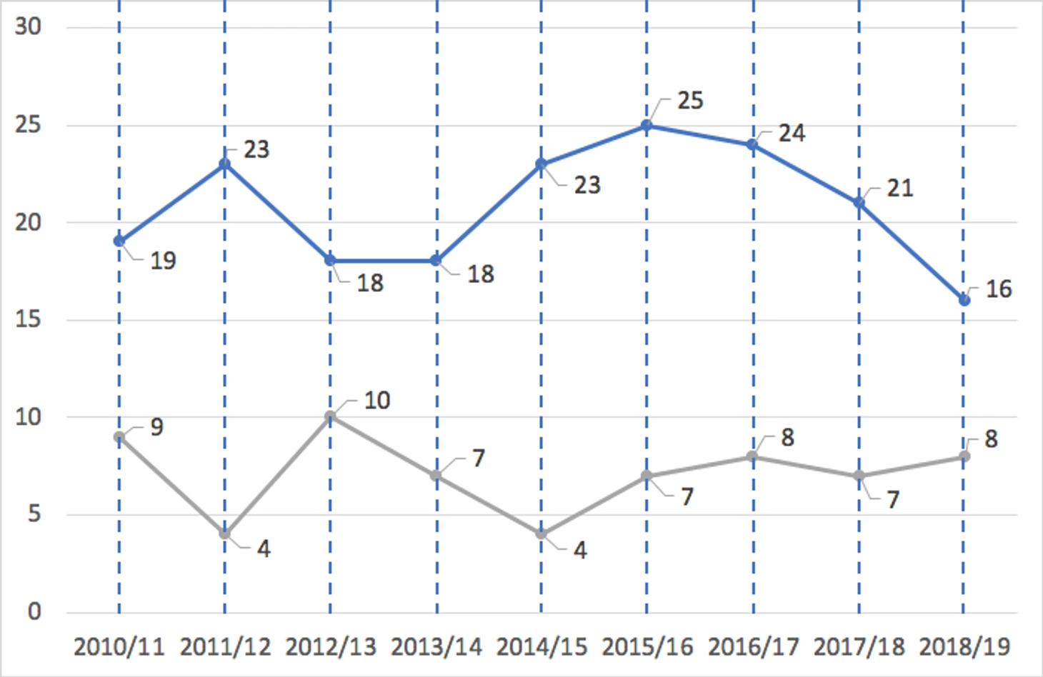 Отступим от разговора о перестройке, к которому мы вернемся чуть позже, и взглянем на график забитых и пропущенных мячей (начиная с сезона 2010/11, заканчивая сезоном 2018/19), где синяя линия олицетворяет динамику забитых голов, а серая пропущенных.