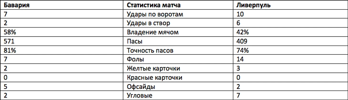 Таблица 2. Ответный матч. Альянц Арена. Бавария-Ливерпуль. 13 Марта 2019 года.