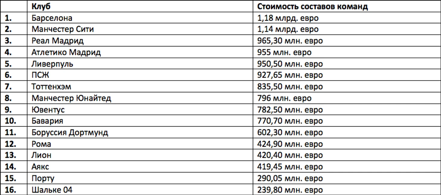 Взглянем на стоимость составов команд, которые участвовали в 1/8 Лиги Чемпионов УЕФА.