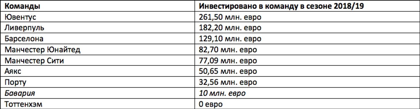 Таблица 2. Инвестиции команд в летнее и зимнее ТО 2018/19, квалифицировавшихся в четвертьфинальную стадию Лиги Чемпионов УЕФА