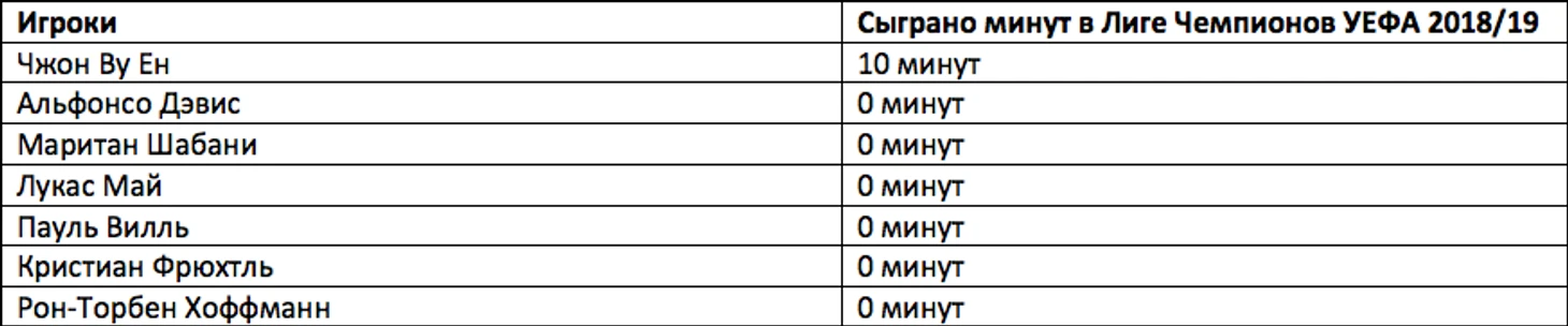 Таблица 2. Молодые игроки Баварии. Количество сыгранных минут в сезоне Лиги Чемпионов УЕФА 2018/19