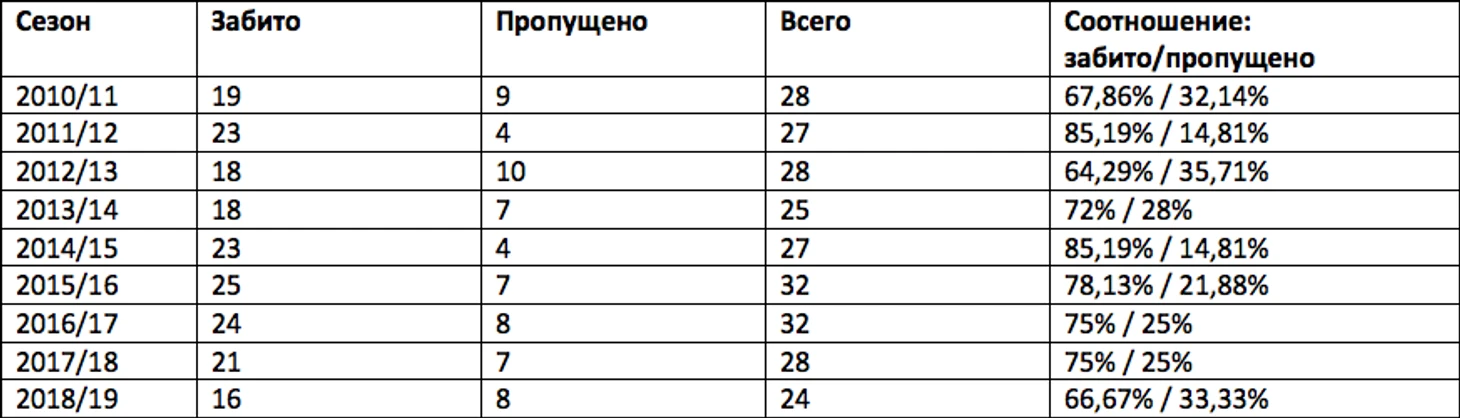 Сравним этот показатель с предыдущими сезонами. Начнем с сезона 2010/11, в котором Бавария также проиграла в 1/8 финала Лиги Чемпионов УЕФА и попрощалась с этим турниром до следующего сезона.