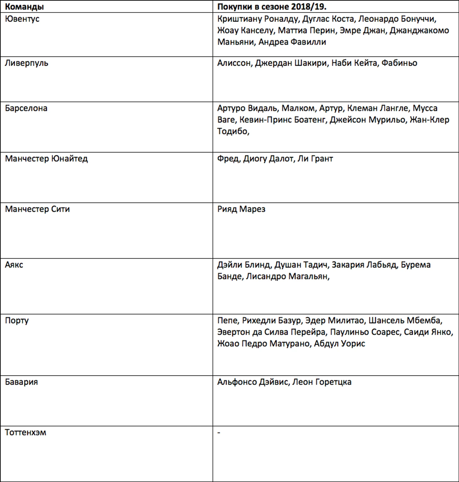 Таблица 3. Покупки команд в летнее и зимнее ТО 2018/19, квалифицировавшихся в четвертьфинальную стадию Лиги Чемпионов УЕФА
