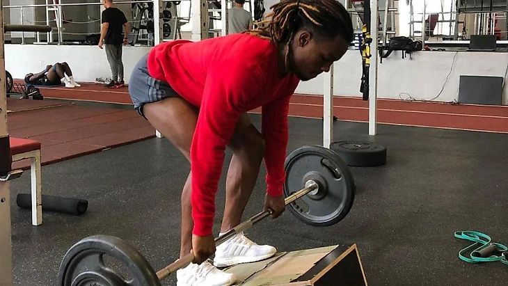 Для развития силы ног, Ренату выполняет становую тягу с трэп-грифом.