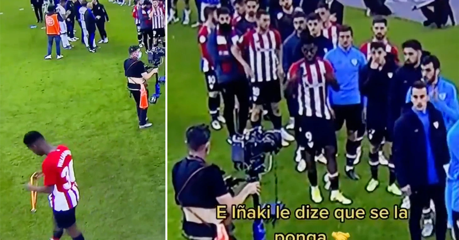 Вы уже наверняка в курсе кинематографичной истории братьев Уильямс из «Атлетика» – если нет, обязательно прочитайте наш текст об удивительном пути их семьи. А сейчас мы подбросим вам еще один повод полюбить этих отличных ребят (ну или как минимум старшего Иньяки). После матча Суперкубка с «Реалом» младший из братьев Нико поступил так же, как обычно поступает большинство футболистов проигравшей команды: получил медаль и сразу же ее снял. Можно по-разному относиться к этой традиции, но старшему Иньяки она явно не по душе. Увидев, как Нико снимает медаль, Иньяки посмотрел на него и жестом показал, что лучше надеть ее обратно.
