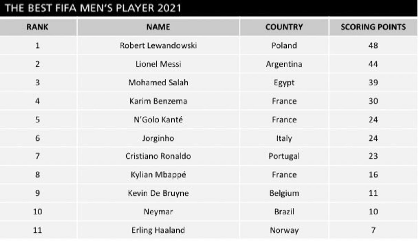 Только что ФИФА назвала Роберта Левандовского лучшим игроком года на премии The Best, но на самом деле отрыв был не таким большим: поляк обошел Лео Месси всего на четыре балла. Между Салахом (третье место) и Бензема (четвертое) отрыв уже поприличнее – 9 очков. В топ-10 попали Канте, Жоржиньо, Роналду, Мбаппе, Де Брюйне и Неймар, который обошел 11-го Холанда на 3 балла.