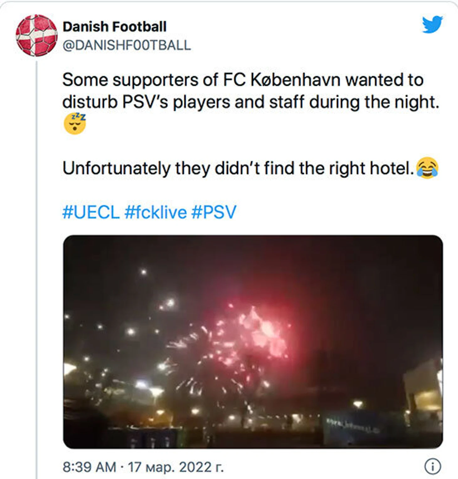 Ночью болельщики отправились к отелю сети Radisson на бульваре Амагер и устроили возле него фейерверк, чтобы футболисты нидерландского топа спали не слишком хорошо. Так часто делают фанаты по всей Европе.