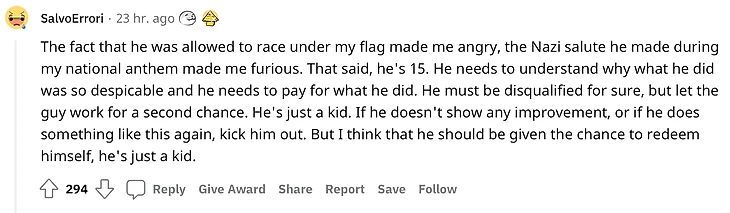 «Тот факт, что ему разрешили выступать под флагом моей страны, меня злит. Тот факт, что он сделал этот жест, когда звучал гимн – просто убивает. При всем при этом – ему 15 лет. Ему нужно понять, почему его поступок был ужасным – и заплатить за это. Точно нужна дисквалификация, но позвольте ему работой заслужить второй шанс. Он просто ребенок. Если ничего не изменится – или он сделает что-то подобное снова – тогда вышвыривайте его. Но думаю, шанса он заслуживает, он просто ребенок».