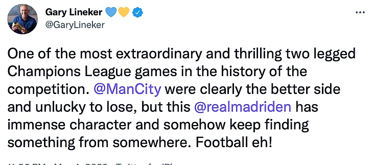 "Одно из самых невероятных и захватывающих двухматчевых противостояний в истории ЛЧ! "Сити" был лучше, им не повезло проиграть. Но у этого "Реала" безумный характер – и они продолжают вытаскивать матчи каким-то чудом. Футбол, а!"